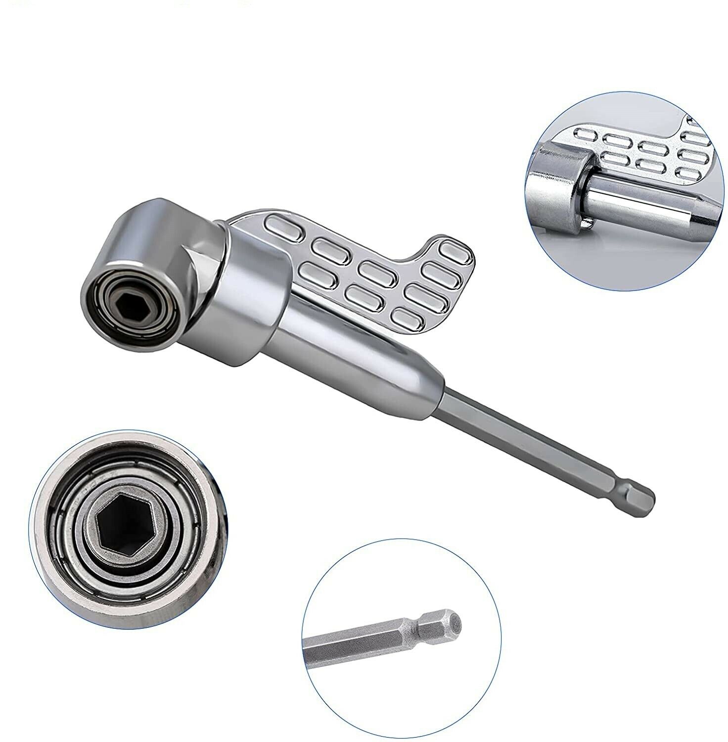 Comodissimo adattatore angolare a 105° per avvitatore/trapano, utile in zone dove il normale cacciavite dritto non può essere utilizzato o in quei spazi stretti dove l'avvitatore non entra.