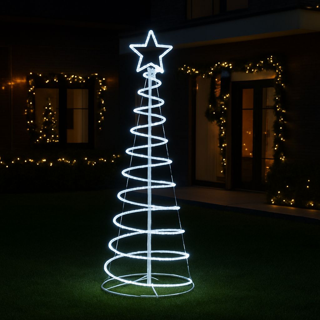 La spirale di luci definisce perfettamente la forma dell’albero, illuminando con un effetto brillante ma delicato, ideale per salotti, terrazze, giardini, balconi, negozi o vetrine.