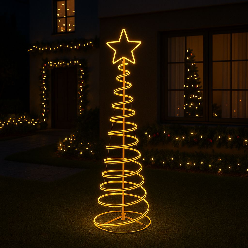 La spirale di luci definisce perfettamente la forma dell’albero, illuminando con un effetto brillante ma delicato, ideale per salotti, terrazze, giardini, balconi, negozi o vetrine.