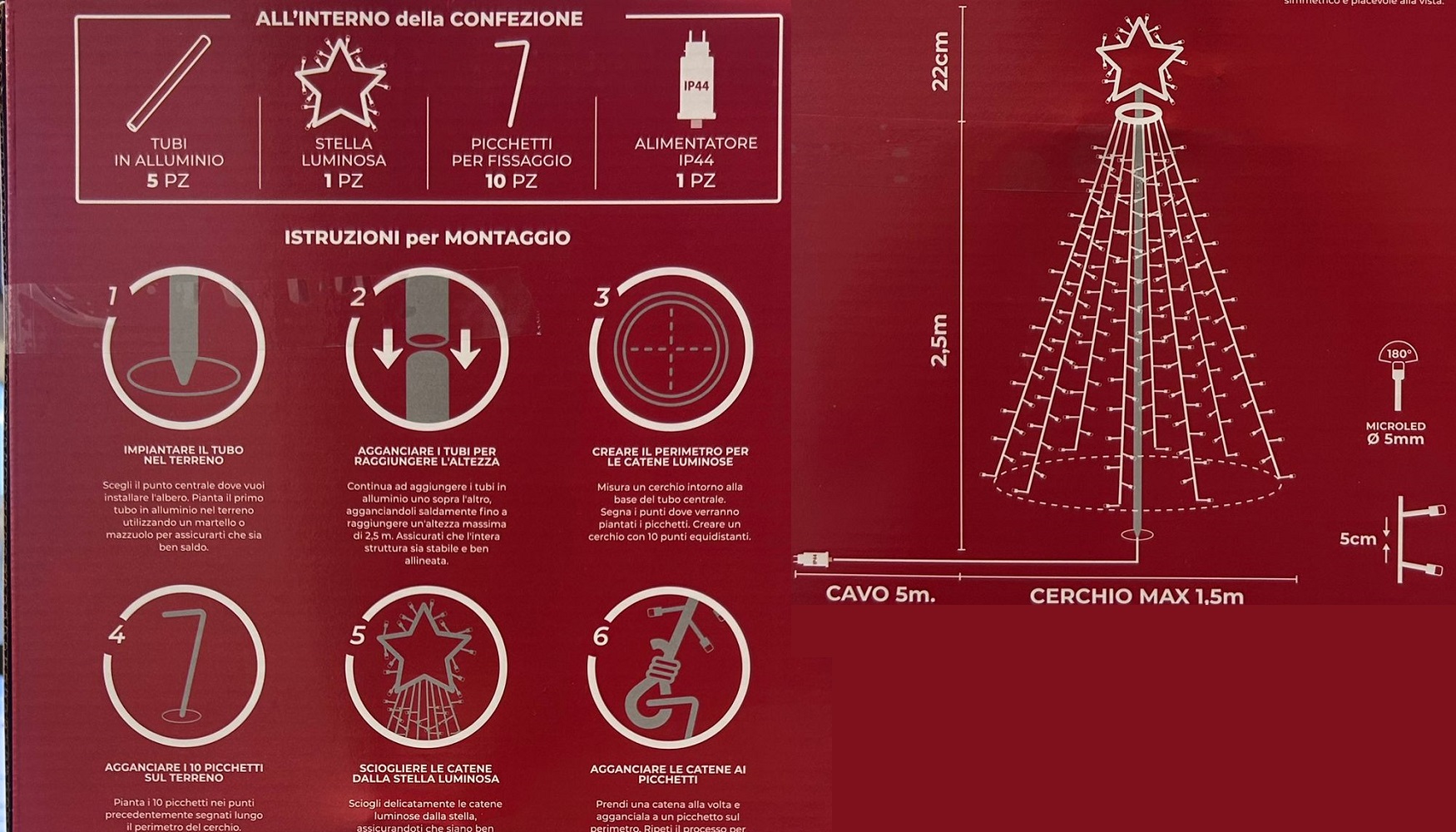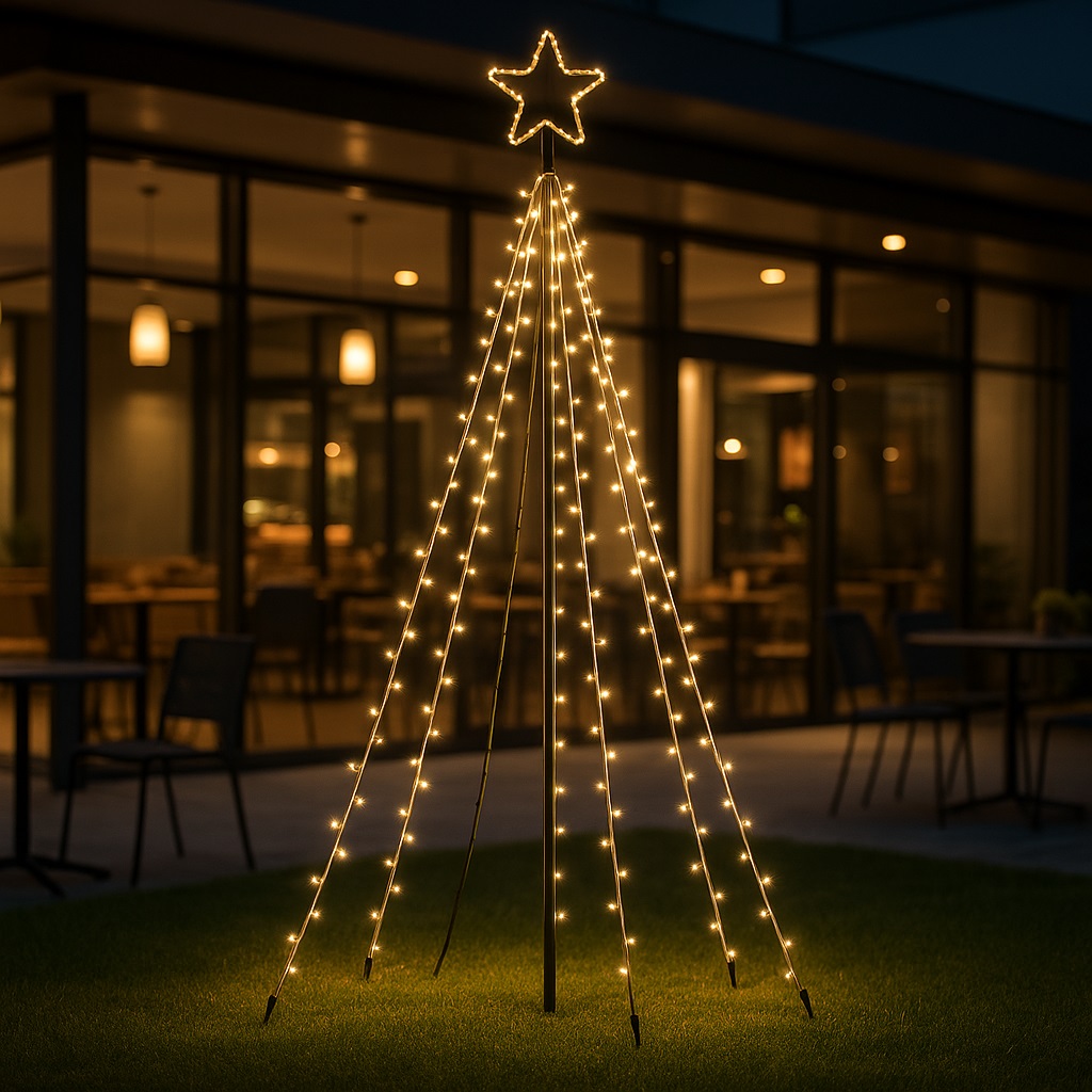 L’albero raggiunge un’altezza di 2,5 metri e dispone di un diametro massimo di 1,5 metri alla base, offrendo una presenza scenografica senza diventare ingombrante. La stella luminosa da 22 cm posta sulla cima completa l’effetto, illuminando la notte con un tocco festoso e brillante.