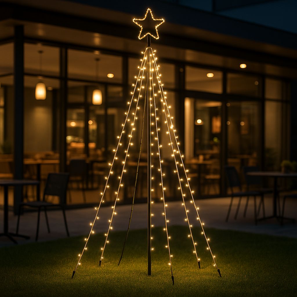 L’albero raggiunge un’altezza di 2,5 metri e dispone di un diametro massimo di 1,5 metri alla base, offrendo una presenza scenografica senza diventare ingombrante. La stella luminosa da 22 cm posta sulla cima completa l’effetto, illuminando la notte con un tocco festoso e brillante.