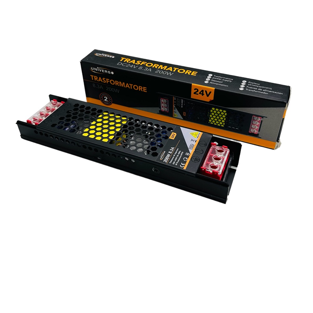 Alimentatore trasformatore slim ultra sottile 24V 8.3A 200W scocca in alluminio colore nero AC 180V - 240V trasformatore per lampadine strisce led telecamere