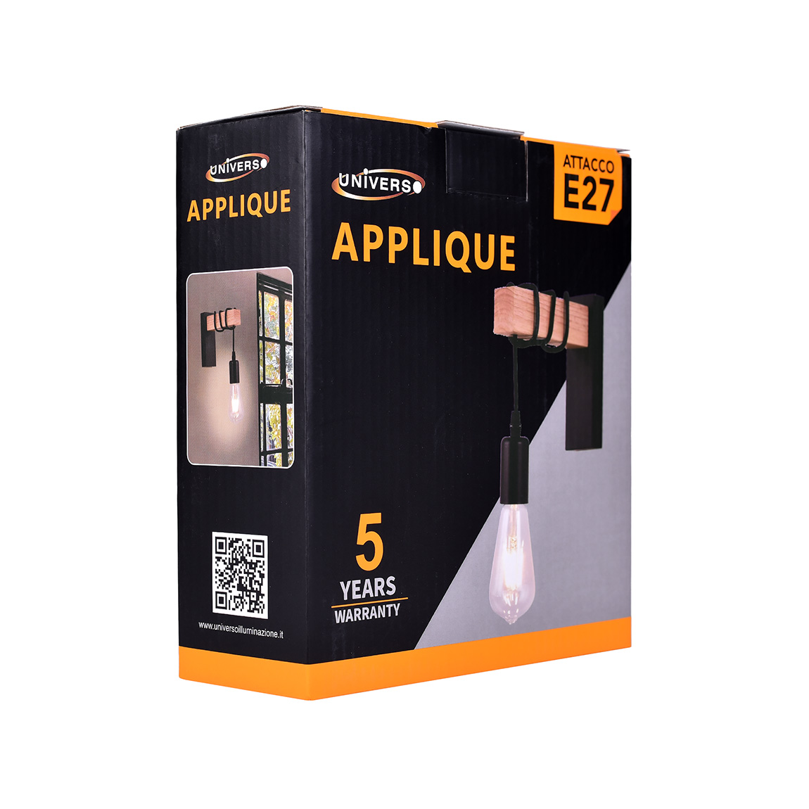 L’applique da parete con attacco E27 rappresenta l’incontro perfetto tra stile industriale e design moderno. La combinazione di metallo nero opaco e legno naturale dona al prodotto un’estetica minimalista ma d’impatto, rendendolo un elemento decorativo oltre che funzionale. Il braccio in legno, fissato perpendicolarmente alla base in metallo, sostiene elegantemente il portalampada e il cavo decorativo, creando una forma pulita e geometrica.