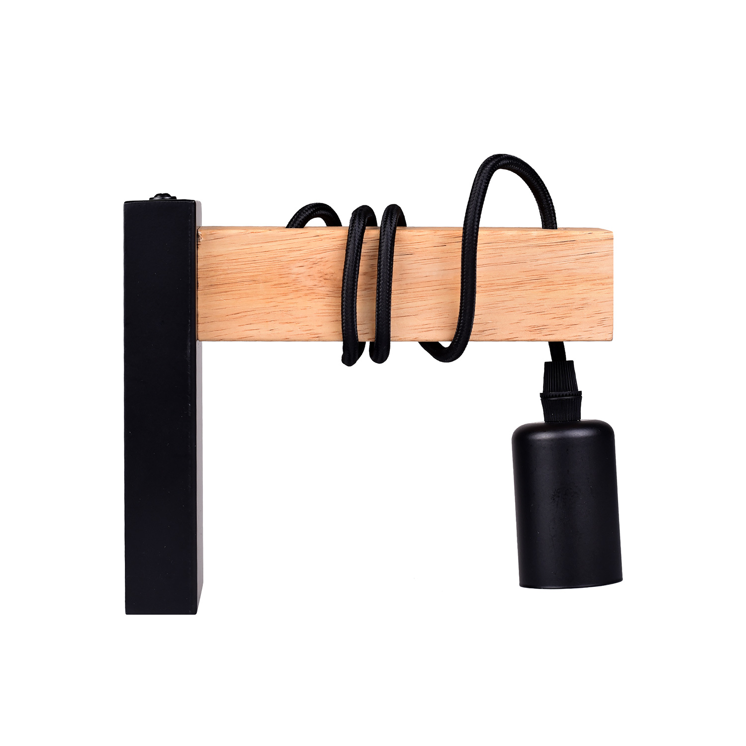 L’applique da parete con attacco E27 rappresenta l’incontro perfetto tra stile industriale e design moderno. La combinazione di metallo nero opaco e legno naturale dona al prodotto un’estetica minimalista ma d’impatto, rendendolo un elemento decorativo oltre che funzionale. Il braccio in legno, fissato perpendicolarmente alla base in metallo, sostiene elegantemente il portalampada e il cavo decorativo, creando una forma pulita e geometrica.