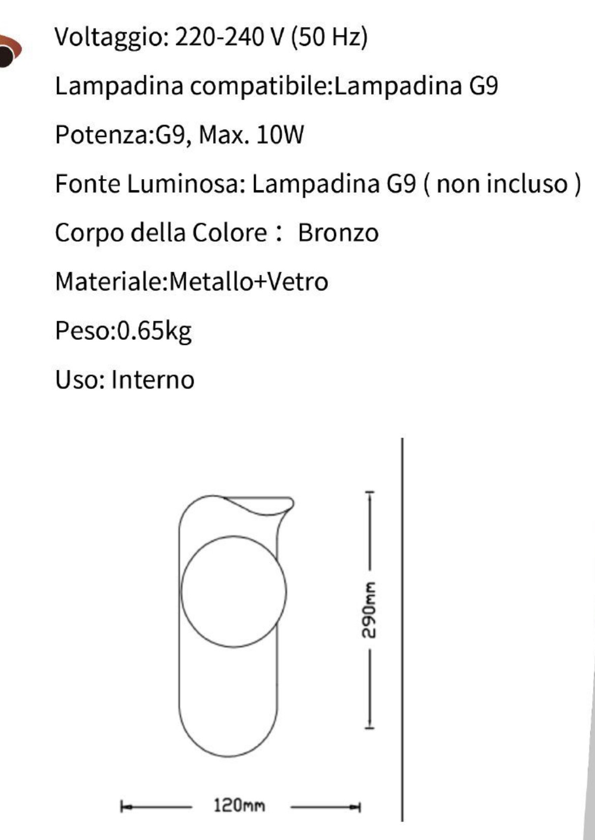 • Realizzata con materiali di alta qualità, la struttura è in metallo, il paralume in vetro. La lampada opera a una tensione di ingresso di 220-240V 50Hz, con dimensioni di 29x12 cm e un peso di 650 grammi.