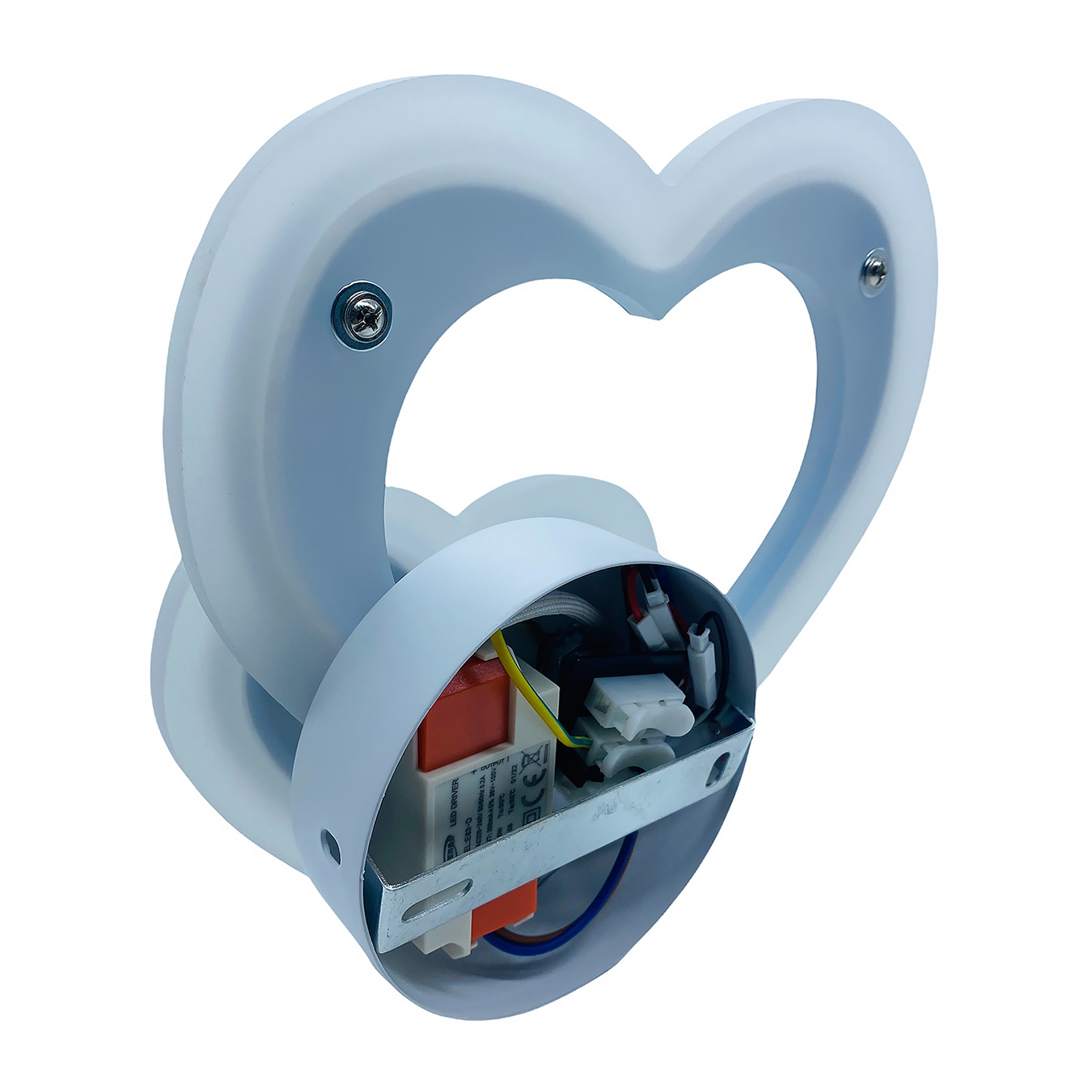 Lampada moderna a forma di doppio cuore da parete con led integrato dalla potenza 12W ideale per l'illuminazione interna di camere da letto - soggiorni - salotti - ingressi - all'interno di negozi - attività commerciali - uffici ed in tutti quei posti dove si vuole installare una lampada dal design stilizzato e moderno. Realizzata in alluminio verniciato di colore bianco con interno del cuore in vetro satinato ha un design adatto per ambienti moderni. Le sue dimensioni la rendono facile da installare, semplice da utilizzare e facile da pulire. Dotata di alimentatore si alimenta a 220V. L' applique è dotato di rosetta con staffa per il fissaggio a parete ed integra morsetti a pinza per un facile collegamento dei fili. L'accensione è immediata La plafoniera ha un angolo di luce diffusa di 300 gradi