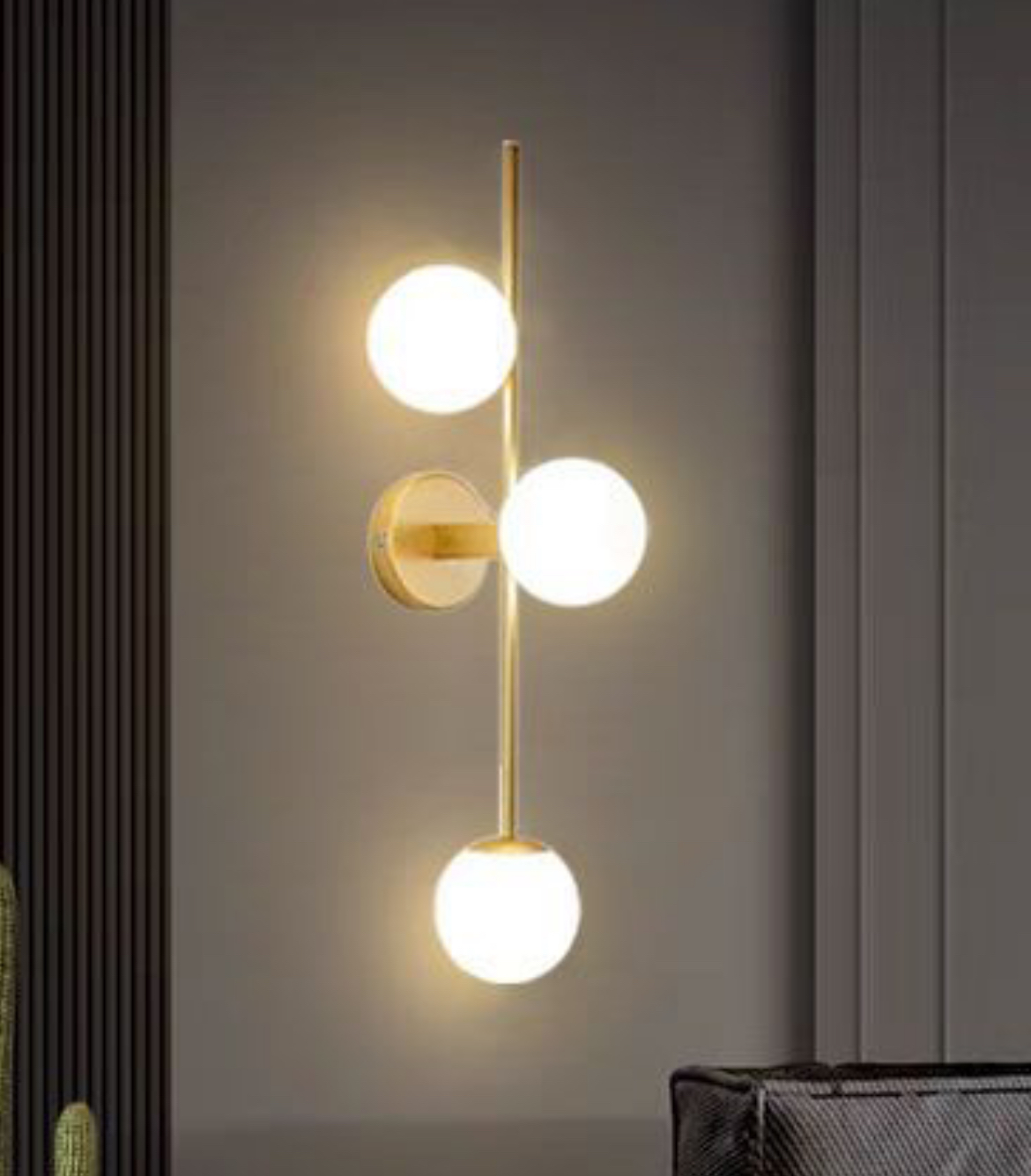 Applique lampada da parete in alluminio color bronzo oro con 3 sfere in vetro bianco opaco palle con attacco per lampadine G9
