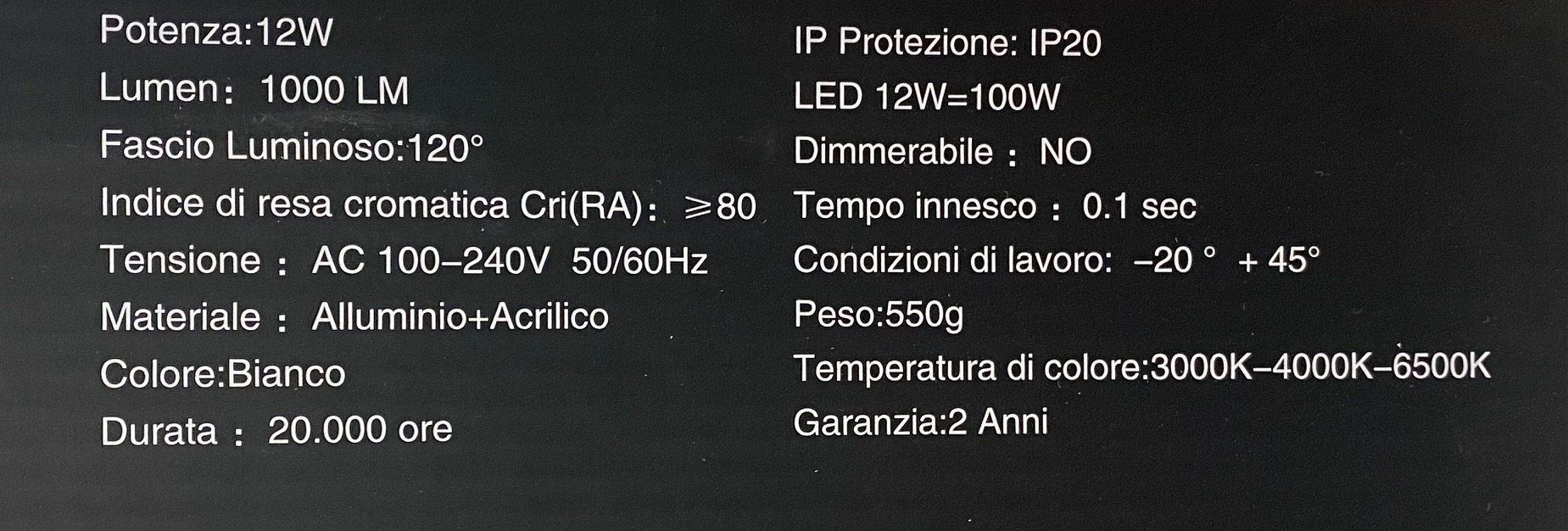 • Caratteristiche tecniche: Potenza 12w Flusso luminoso: 1000lm Fascio luminoso: 120° Peso: 550 grammi IP20 Frequenza: 50/60hz Tensione: AC 85/265V non dimmerabile Composizione: alluminio. Dimensioni 345x97x97 mm