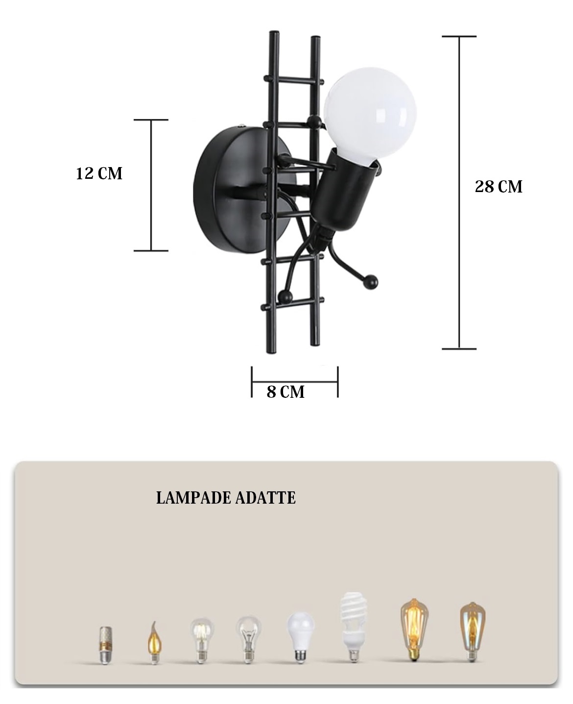 Applique Lampada da parete moderna con attacco E27 forma Omino Nero su scala