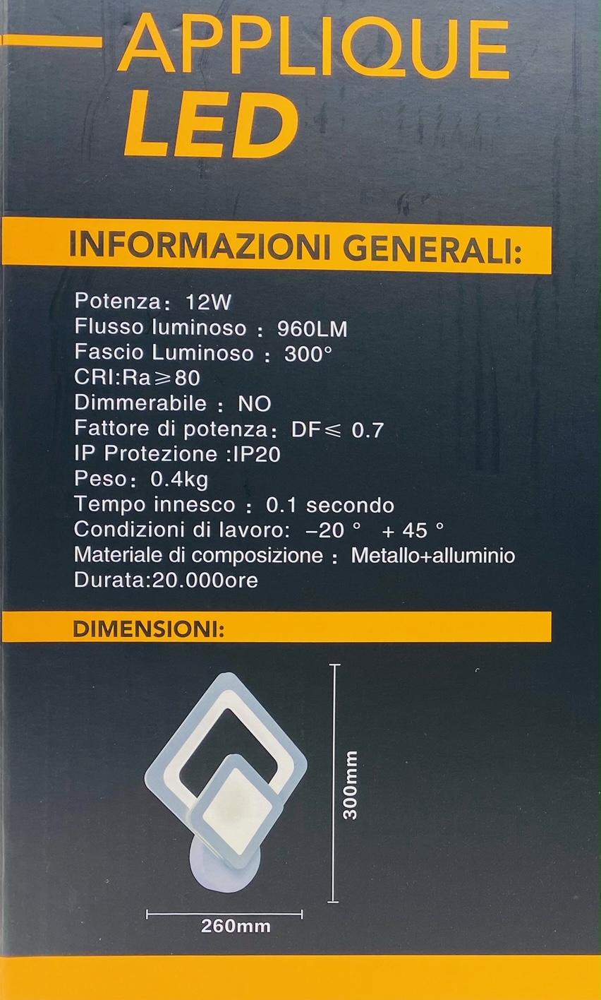• Lampada moderna da parete con led integrato dalla forma di doppio Rombo potenza 12W ideale per l'illuminazione interna di camere da letto - soggiorni - salotti - ingressi - all'interno di negozi - attività commerciali - uffici ed in tutti quei posti dove si vuole installare una lampada dal design stilizzato e moderno.