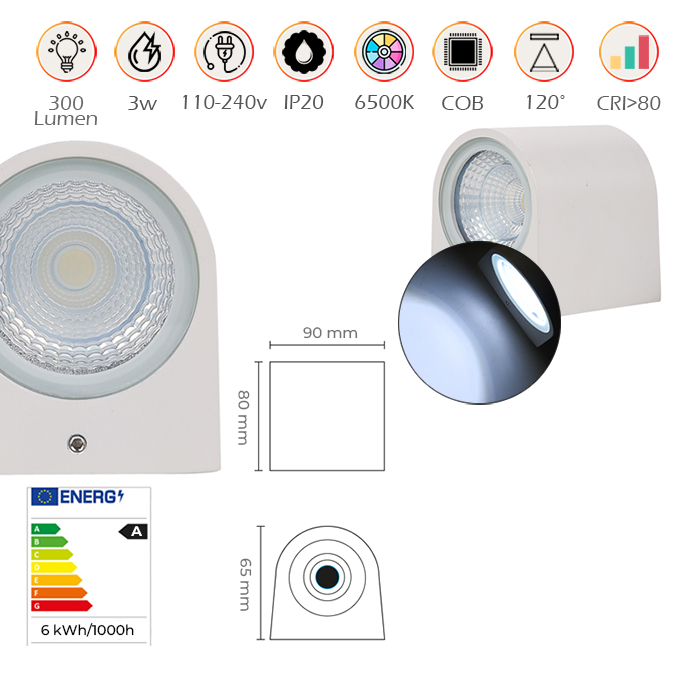 Scopri l'applique LED 3W per interni, una soluzione ideale per illuminare i tuoi spazi con eleganza ed efficienza. Questo prodotto si distingue per la luce bianca fredda a 6500K, che garantisce un'illuminazione chiara e nitida, perfetta per evidenziare dettagli architettonici o creare ambienti accoglienti. Realizzata in alluminio bianco di alta qualità, questa applique vanta una forma semicilindrica moderna, che si adatta perfettamente a ogni stile di arredamento. Grazie al chip LED COB da 3W, offre una potenza luminosa di 300 lumen, distribuiti con un angolo di illuminazione di 120°, ideale per coprire ampie aree senza sprechi di energia. La classe energetica A+ rende questo prodotto una scelta ecologica e conveniente, con un consumo ridotto e una lunga durata nel tempo. Il design con grado di protezione IP20 lo rende idoneo per ambienti interni, garantendo resistenza a polvere e umidità occasionali. L'applique LED 3W opera con una tensione di alimentazione di 110-265V AC e una frequenza di 50/60 Hz, assicurando stabilità e sicurezza nell'uso quotidiano. Il CRI superiore a 80 garantisce una resa cromatica naturale e piacevole, perfetta per valorizzare colori e materiali nelle vicinanze. Le dimensioni compatte di 90 x 80 x 65 mm facilitano l'installazione, anche in spazi ristretti. Scegliere l'applique LED 3W significa optare per un prodotto all'avanguardia, che combina tecnologia, design e sostenibilità. Con una temperatura di colore fredda a 6500K, è perfetta per illuminare zone di lavoro, passaggi o spazi che richiedono una luce vivace e stimolante. Affidati a un'illuminazione di qualità superiore per trasformare i tuoi ambienti con stile e funzionalità. L'applique LED 3W è la scelta ideale per chi cerca performance elevate e un design curato nei dettagli