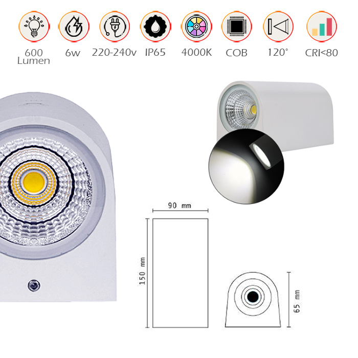 L'applique LED 6W semicilindrica con doppia emissione luminosa è una soluzione versatile e funzionale per illuminare spazi interni ed esterni con eleganza e semplicità. La luce naturale 4000K emessa dai LED COB (Chip On Board) integrati crea un'atmosfera confortevole e rilassante, perfetta per ambienti residenziali e commerciali. Grazie alla doppia emissione luminosa, questa applique proietta la luce sia verso l'alto che verso il basso, generando un effetto visivo raffinato e moderno, ideale per esaltare facciate, terrazze, balconi e giardini. Costruita con materiali di alta qualità, come l’alluminio verniciato bianco, questa applique garantisce robustezza e durabilità, resistendo efficacemente agli agenti atmosferici grazie al grado di protezione IP65. Le sue caratteristiche tecniche avanzate, tra cui un'efficienza luminosa di 100 lumen/watt, un angolo di illuminazione di 120° e una luminosità totale di 600 lumen, assicurano prestazioni eccellenti e un’illuminazione uniforme. Con un design cilindrico sobrio e moderno, questo prodotto si integra perfettamente in ogni stile architettonico, rendendolo una scelta ideale per chi desidera combinare funzionalità ed estetica. La luce naturale 4000K offre un equilibrio cromatico ottimale, simulando la tonalità della luce diurna e garantendo una resa cromatica fedele (CRI >80) che valorizza i dettagli di ogni ambiente. L'applique LED è classificata in classe energetica A+, assicurando un risparmio significativo sui consumi energetici rispetto alle tradizionali fonti di luce. La vita utile di 25.000 ore riduce la necessità di frequenti sostituzioni, rendendola una scelta economica e sostenibile. Alimentata con una tensione universale (110-265V AC) e una frequenza di 50/60 Hz, questa applique è progettata per un'installazione semplice e compatibile con diversi contesti. Le dimensioni compatte (150 x 90 x 65 mm) e la forma cilindrica facilitano l'installazione anche in spazi ridotti, mentre il design raffinato la rende adatta sia per l’illuminazione funzionale che decorativa. Questa applique LED è la soluzione ideale per chi cerca una luce naturale, confortevole e di alta qualità per trasformare ogni spazio con eleganza e modernità