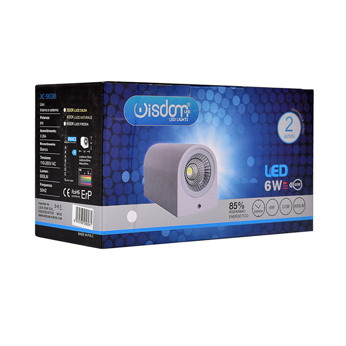 L'applique LED 6W semicilindrica con doppia emissione luminosa è una soluzione versatile e funzionale per illuminare spazi interni ed esterni con eleganza e semplicità. La luce naturale 4000K emessa dai LED COB (Chip On Board) integrati crea un'atmosfera confortevole e rilassante, perfetta per ambienti residenziali e commerciali. Grazie alla doppia emissione luminosa, questa applique proietta la luce sia verso l'alto che verso il basso, generando un effetto visivo raffinato e moderno, ideale per esaltare facciate, terrazze, balconi e giardini. Costruita con materiali di alta qualità, come l’alluminio verniciato bianco, questa applique garantisce robustezza e durabilità, resistendo efficacemente agli agenti atmosferici grazie al grado di protezione IP65. Le sue caratteristiche tecniche avanzate, tra cui un'efficienza luminosa di 100 lumen/watt, un angolo di illuminazione di 120° e una luminosità totale di 600 lumen, assicurano prestazioni eccellenti e un’illuminazione uniforme. Con un design cilindrico sobrio e moderno, questo prodotto si integra perfettamente in ogni stile architettonico, rendendolo una scelta ideale per chi desidera combinare funzionalità ed estetica. La luce naturale 4000K offre un equilibrio cromatico ottimale, simulando la tonalità della luce diurna e garantendo una resa cromatica fedele (CRI >80) che valorizza i dettagli di ogni ambiente. L'applique LED è classificata in classe energetica A+, assicurando un risparmio significativo sui consumi energetici rispetto alle tradizionali fonti di luce. La vita utile di 25.000 ore riduce la necessità di frequenti sostituzioni, rendendola una scelta economica e sostenibile. Alimentata con una tensione universale (110-265V AC) e una frequenza di 50/60 Hz, questa applique è progettata per un'installazione semplice e compatibile con diversi contesti. Le dimensioni compatte (150 x 90 x 65 mm) e la forma cilindrica facilitano l'installazione anche in spazi ridotti, mentre il design raffinato la rende adatta sia per l’illuminazione funzionale che decorativa. Questa applique LED è la soluzione ideale per chi cerca una luce naturale, confortevole e di alta qualità per trasformare ogni spazio con eleganza e modernità