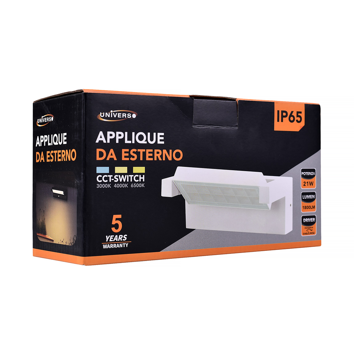 Grazie a questa funzionalità, l'applique LED può essere adattata in base alle necessità, rendendola una scelta versatile per qualsiasi contesto. Efficienza Energetica e Lunga Durata: Rispetto alle tradizionali lampade alogene, questa applique LED 21W offre un significativo risparmio energetico, riducendo i consumi e abbassando le spese in bolletta. Con una durata stimata di oltre 20.000 ore, garantisce un utilizzo prolungato senza necessità di frequenti interventi di manutenzione. Applicazioni e Versatilità Grazie alla sua versatilità, questa lampada da parete è perfetta per ambienti residenziali e commerciali. Può essere installata per illuminare ingressi, percorsi pedonali, cortili, terrazze, balconi e facciate di hotel, ristoranti o negozi. La luce emessa è uniforme e priva di sfarfallii, garantendo un comfort visivo superiore. Installazione Semplice e Sicura: L'Applique LED Bianco 21W è progettata per un'installazione facile e veloce. Può essere fissata direttamente alla parete con pochi passaggi, assicurando stabilità e sicurezza nel tempo. Il design compatto e il colore neutro permettono un perfetto abbinamento con qualsiasi stile architettonico. Scegli l'Applique LED Bianco 21W da Esterno con CCT Switch per un'illuminazione regolabile, efficiente e di alta qualità. Perfetta per creare ambienti luminosi, sicuri ed eleganti con il massimo risparmio energetico