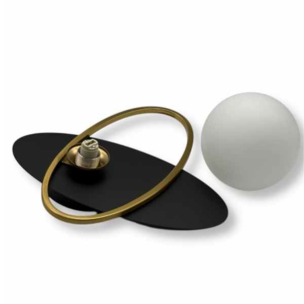 • Stile Moderno ed Elegante – Applique da parete dal design geometrico minimalista, con struttura in metallo nero, anello dorato e sfera acrilica bianca opaca Ø15cm, perfetta per ambienti raffinati.
