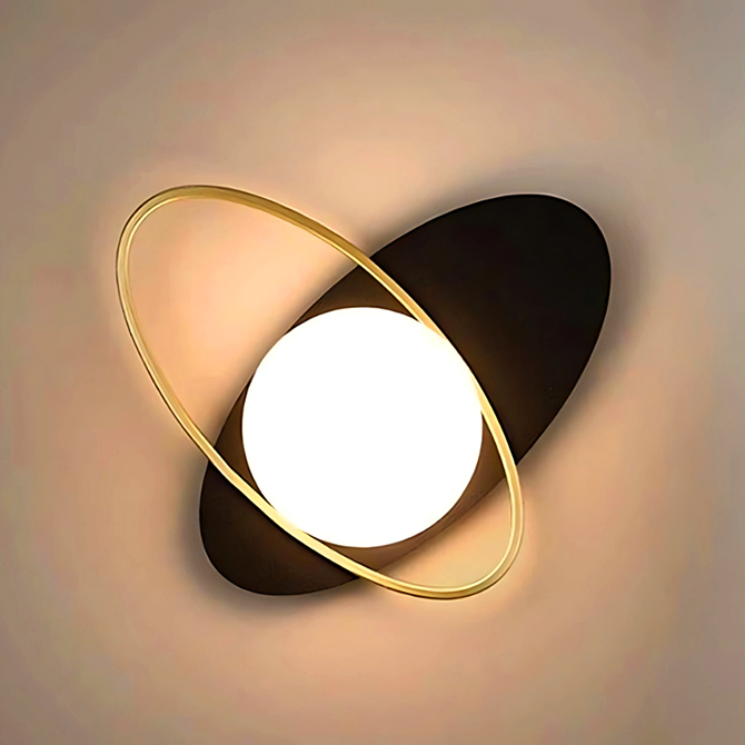 • Stile Moderno ed Elegante – Applique da parete dal design geometrico minimalista, con struttura in metallo nero, anello dorato e sfera acrilica bianca opaca Ø15cm, perfetta per ambienti raffinati.
