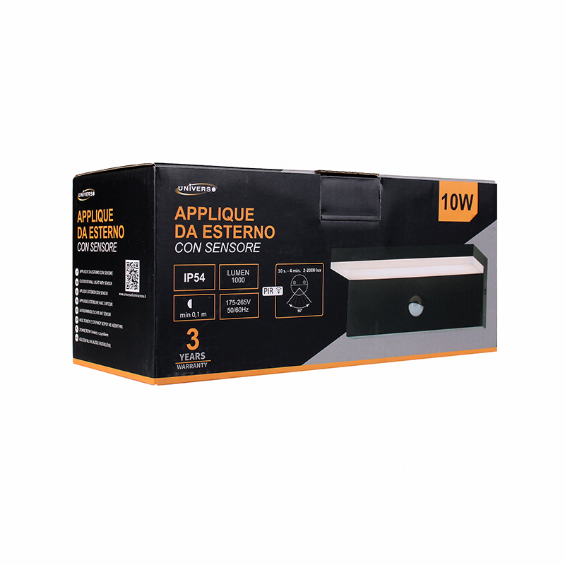 L'introduzione di soluzioni di illuminazione esterna come l'applique LED con sensore movimento rappresenta un passo avanti nel design moderno e nell'efficienza energetica. Questa lampada non solo offre un flusso luminoso di 1000 lumen ma garantisce anche una distribuzione uniforme della luce naturale a 4000K, ideale per creare un'atmosfera accogliente e rilassante in tutti gli spazi esterni. Realizzata con materiali di primissima scelta, come l'ABS e il PVC, la nostra applique LED si distingue per il suo design rettangolare e raffinato. Il colore nero aggiunge un tocco di eleganza e sobrietà, rendendola un complemento perfetto per l'architettura contemporanea, sia in contesti residenziali che commerciali. Grazie al suo grado di protezione IP54, è particolarmente resistente alle intemperie, garantendo durabilità anche in condizioni ambientali avverse. Uno degli aspetti più innovativi di questa applique è il sensore di movimento PIR integrato, che consente alla lampada di accendersi automaticamente al passaggio della persona. Questa funzionalità non solo offre comodità ma è anche un eccellente metodo per risparmiare energia, poiché la luce è utilizzata solo quando necessario. Il sensore PIR è utilizzato per rilevare il movimento attraverso la misurazione delle variazioni di temperuta nell'ambiente circostante. Sul sensore troverete 2 regolatori, uno serve per dire in pratica alla lampada che si deve accendere al passaggio solo quando in esterno vi è una certa temperatura di luce, l'altro regolatore invece funge da timer che al passaggio lo si può impostare lasciando lampada accesa per 10 secondi fino ad un massimo di 4 minuti.  L'applique LED da esterno è dotata di una potenza di 10W che, combinata con un angolo di illuminazione ampio di 120°, assicura una copertura luminosa estesa. Il suo indice di resa cromatica (CRI) superiore a 80 permette di godere di colori naturali e vividi, migliorando l'esperienza visiva degli spazi esterni. Inoltre, con una vita media di 25.000 ore, questa lampada riduce significativamente la frequenza di sostituzione e manutenzione, contribuendo alla sostenibilità ambientale grazie alla tecnologia LED a basso consumo. L'applique è progettata per essere facile da installare, fornita con viti di fissaggio per un montaggio rapido e sicuro. La sua flessibilità di alimentazione, adattabile a tensioni che variano tra 175-265V AC e frequenze di 50/60 Hz, la rende compatibile con vari impianti elettrici, facilitando l'integrazione in diversi contesti. Le sue dimensioni compatte di 210x90x82 mm e il peso leggero di 300g la rendono ideale per essere posizionata in punti strategici come ingressi, vialetti, e aree giardino, dove può migliorare la sicurezza e l'accoglienza senza sovraccaricare visivamente l'ambiente