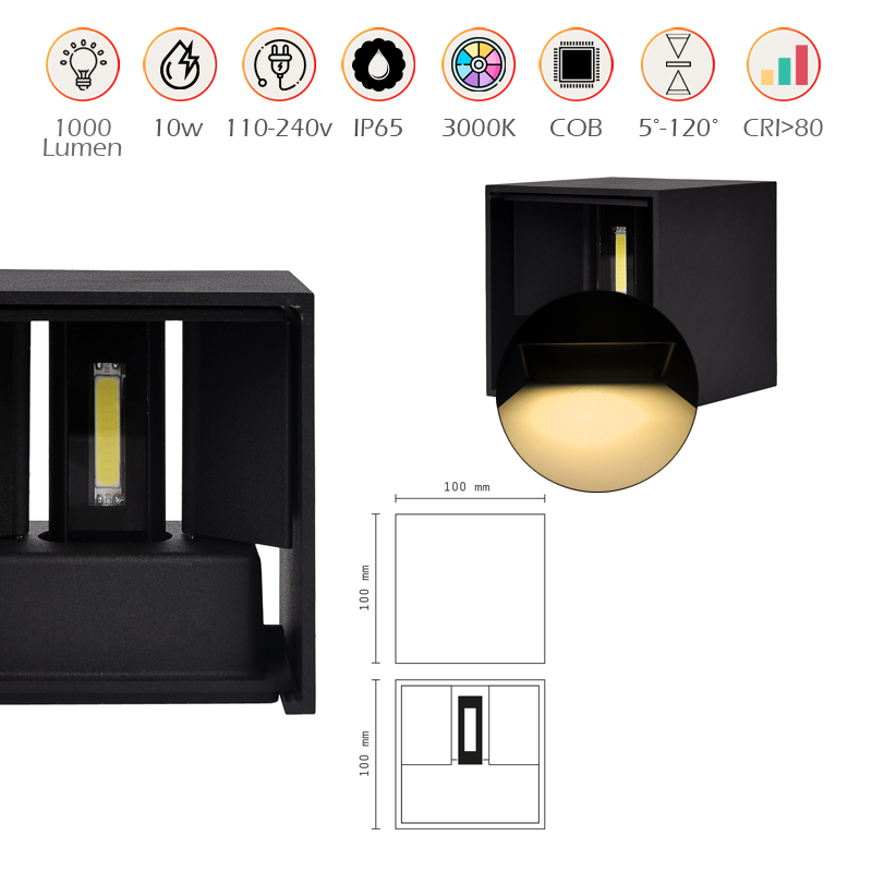Rendi unici i tuoi spazi con l’applique LED nero a forma di cubo, un’illuminazione moderna e versatile che unisce stile e tecnologia. Questo modello, progettato per ambienti interni ed esterni, offre una calda luce a 3000K, ideale per creare un’atmosfera accogliente e rilassante. La potenza di 10W, supportata dalla tecnologia LED COB integrata, garantisce un’intensità luminosa di 1000 lumen, rendendola perfetta per valorizzare facciate, terrazzi, giardini o spazi interni come corridoi e soggiorni. La struttura in alluminio verniciato a polvere non solo conferisce resistenza e durabilità, ma assicura anche un look elegante e contemporaneo. Grazie al processo di verniciatura avanzato, lo strato protettivo risulta uniforme e spesso, offrendo una protezione ottimale contro gli agenti atmosferici. Questo, insieme al grado di protezione IP65, rende l’applique una scelta eccellente per applicazioni in ambienti esterni esposti a umidità e polvere. Un elemento distintivo di questa applique LED è la doppia emissione luminosa regolabile, che consente di personalizzare il cono di luce grazie alle alette integrate. L’angolo di illuminazione può essere regolato con precisione, variando da un minimo di 5° fino a un massimo di 120°. Questa versatilità permette di adattare l’illuminazione a qualsiasi esigenza estetica e funzionale, creando effetti di luce raffinati e suggestivi. Dotata di una classe energetica A+, questa applique garantisce efficienza e risparmio energetico. La durata media di 30.000 ore ne sottolinea l’affidabilità, mentre la qualità della luce è garantita da un CRI superiore a 80, che riproduce i colori in modo naturale e gradevole. La tensione di alimentazione AC 85-265V e la frequenza di 50/60 Hz la rendono compatibile con diversi standard elettrici, semplificando l’installazione. Le dimensioni compatte di 100x100x100 mm la rendono adatta a qualsiasi contesto, integrandosi perfettamente in ambienti moderni o classici. Le viti di fissaggio incluse facilitano il montaggio, rendendo il prodotto immediatamente pronto all’uso. Che si tratti di illuminare un ingresso, evidenziare una parete o creare un punto luce decorativo, questa applique LED a luce calda rappresenta una soluzione completa e versatile, con un design senza tempo e prestazioni eccellenti