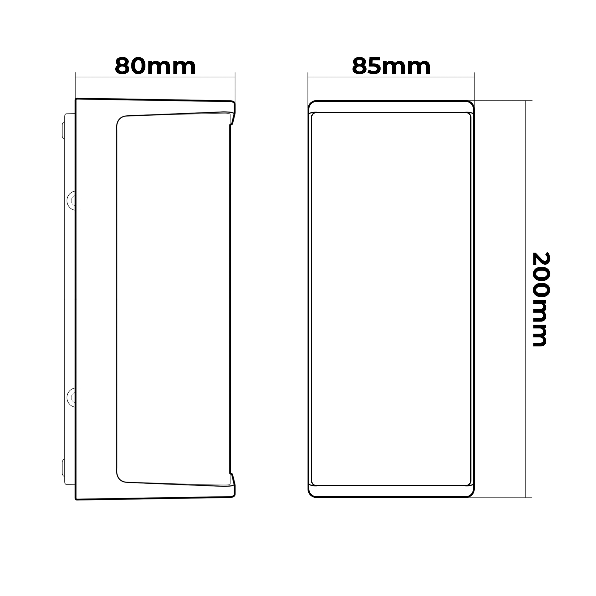 Infografica Lampada da Parete Rettangolare con Dimensioni 200x85x80mm