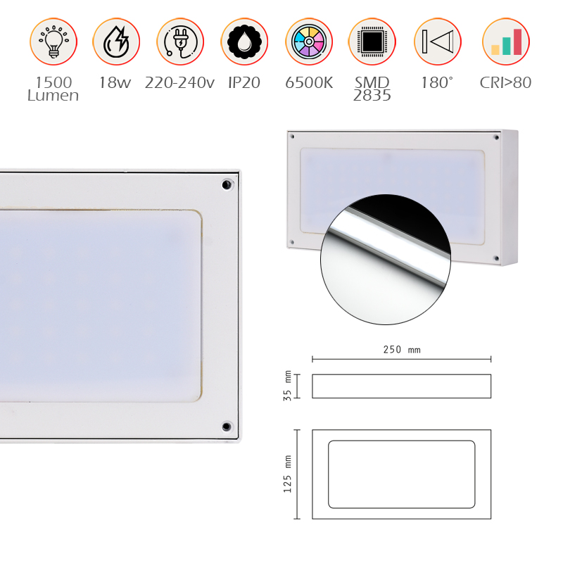 Scopri l'applique LED a parete da 18W con mono-emissione luminosa, ideale per chi cerca un'illuminazione efficace e di design. Questa applique è progettata per ambienti interni, dove la sua luce fredda a 6500K crea un'atmosfera raffinata e contemporanea. Grazie alla tecnologia LED integrata con chip SMD 2835, offre una resa luminosa ottimale con un flusso luminoso di 1500 lumen, garantendo consumi energetici contenuti e una lunga durata. La sua forma rettangolare slim, unita al design minimalista in alluminio bianco, rende questa applique una scelta versatile per ogni stile d’arredo, da quello moderno a quello classico. L’applique si distingue per il suo grado di protezione IP20, adatta ad ambienti interni sicuri e asciutti, e per la facilità di installazione grazie agli accessori di fissaggio inclusi. Con una classe energetica A+, assicura risparmio energetico senza rinunciare alla qualità. Ideale per salotti, corridoi, camere da letto o ambienti di lavoro, garantisce una distribuzione uniforme della luce grazie a un angolo di illuminazione di 180°. Questo dispositivo è stato progettato per durare, con una vita media stimata di 30.000 ore. Alimentato da una tensione di rete di AC 85-265 V e funzionante a una frequenza di 50/60 Hz, offre stabilità e sicurezza. La resa cromatica superiore a CRI >80 valorizza i dettagli degli ambienti, rendendoli vividi e naturali. Non solo un complemento d’arredo, ma un vero e proprio strumento per trasformare i tuoi spazi con eleganza e funzionalità