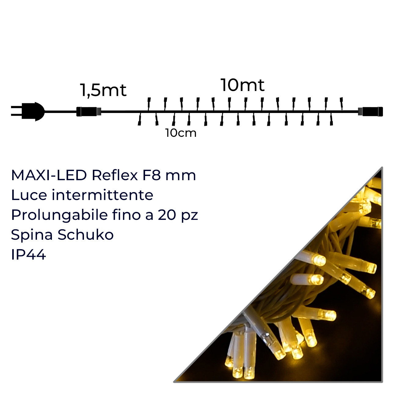 Infografica Catena 100 LED Cavo Bianco da 10 Metri Luce 90% Oro Fissa e 10% Bianca Flash