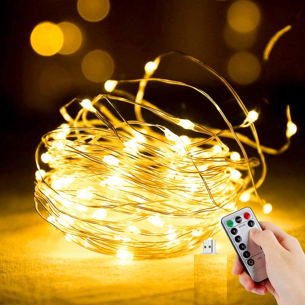 Catena 100 micro led 10mt filo rame batteria da esterno luce calda Telecomando