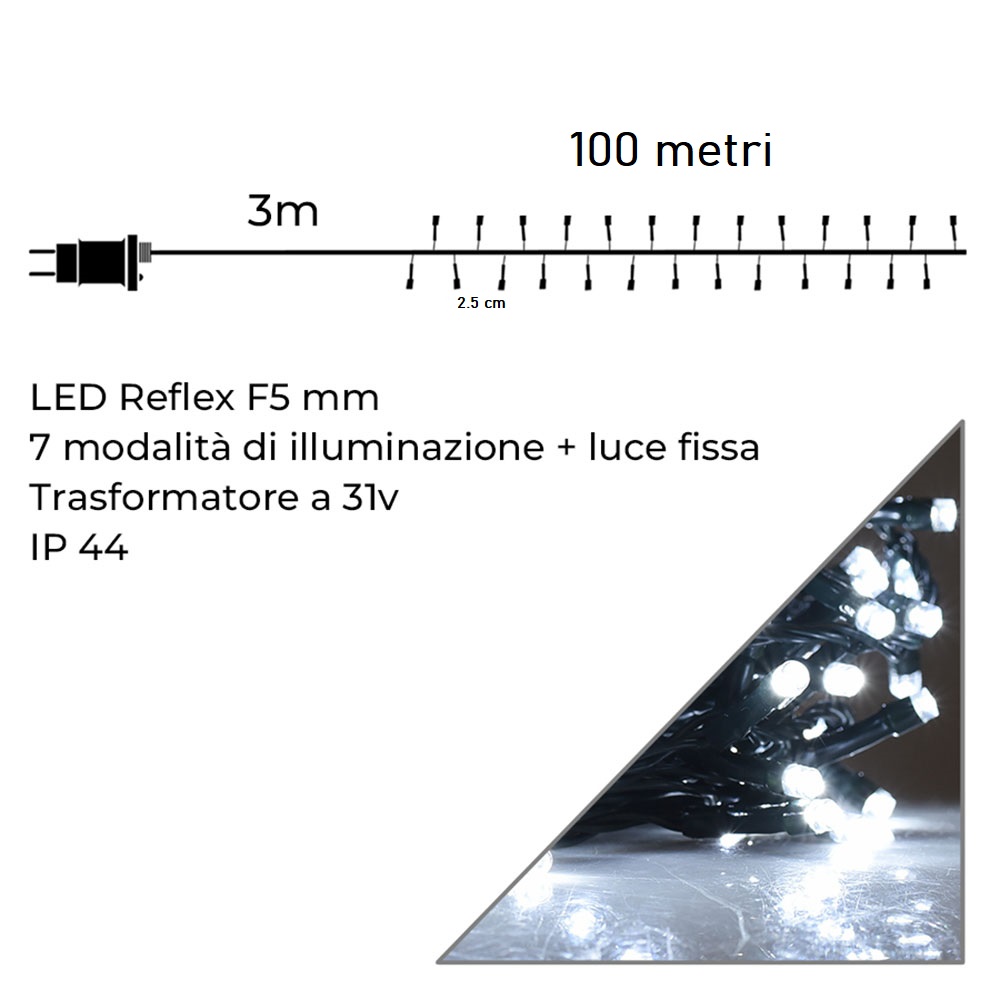 Catena luminosa natalizia con 4000 led luce bianca fredda 100mt di catena 36V cavo verde decorare il Natale spazi esterno interno albero e balconi con 8 giochi