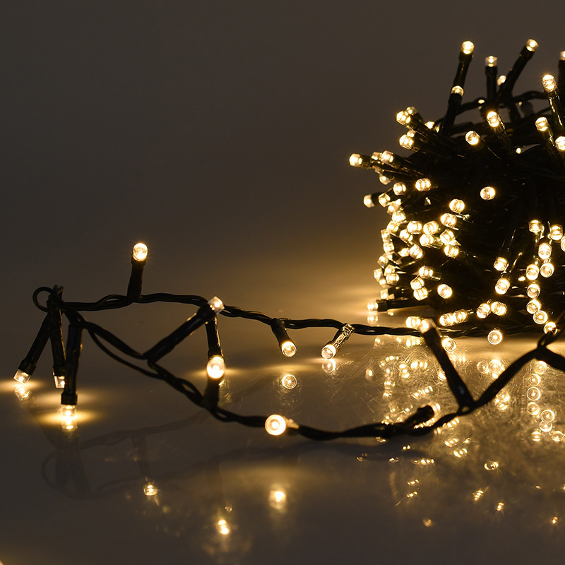 La catena di luci gialle da 1360 LED con cavo verde e trasformatore 36V è una soluzione versatile ideale per decorazioni interne ed esterne in ogni stagione. Con una lunghezza totale di 41 metri, questa catena luminosa è perfetta per creare un'atmosfera accogliente e festiva in qualsiasi ambiente. Le 8 modalità di illuminazione, che includono effetti come luce fissa, lampeggiante, sequenziale, a onda e combinata, offrono una varietà di opzioni per adattarsi a diverse esigenze decorative, sia durante le festività che in altri momenti dell'anno. Il cavo verde flessibile si integra perfettamente con l'ambiente naturale, rendendo questa catena luminosa quasi invisibile durante il giorno. La luce gialla emessa dai LED F5 mm crea un'atmosfera calda e invitante, ideale per serate speciali, eventi all'aperto, feste di compleanno, matrimoni e altre celebrazioni. Questa catena di luci a LED si distingue per la sua efficienza energetica. Con un consumo di soli 12W, offre un'illuminazione intensa e brillante senza aumentare significativamente la bolletta elettrica. Il trasformatore da 36V garantisce una tensione di alimentazione sicura e stabile, proteggendo i LED e prolungandone la durata. La distanza di 2,5 cm tra i LED assicura una distribuzione uniforme della luce lungo tutta la lunghezza della catena, eliminando zone d'ombra e garantendo un effetto luminoso continuo e piacevole. Il cavo di alimentazione di 3 metri offre una buona flessibilità per collegare la catena di luci a una presa elettrica senza problemi di distanza. Questa catena di luci è dotata di un grado di protezione IP44, il che significa che è resistente agli spruzzi d'acqua e può essere utilizzata all'aperto senza preoccupazioni, anche in condizioni meteorologiche avverse. Che si tratti di decorare il giardino, il patio, il balcone o un'area interna, questa catena di luci a LED è in grado di resistere a pioggia e umidità, mantenendo sempre una performance ottimale. L'installazione è semplice e rapida grazie alla flessibilità del cavo e alla robustezza dei LED. Puoi avvolgerla intorno ad un albero, fissarla lungo una ringhiera, o utilizzarla per creare splendidi giochi di luce su pareti e soffitti. Le otto modalità di illuminazione permettono di personalizzare l'illuminazione secondo i propri gusti e l'atmosfera desiderata