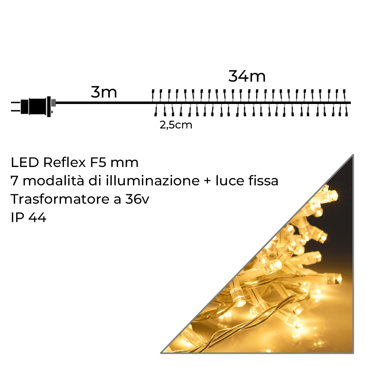 Infografica Catena 1360 LED Luce Gialla 34mt Cavo Trasparente su Sfondo Bianco