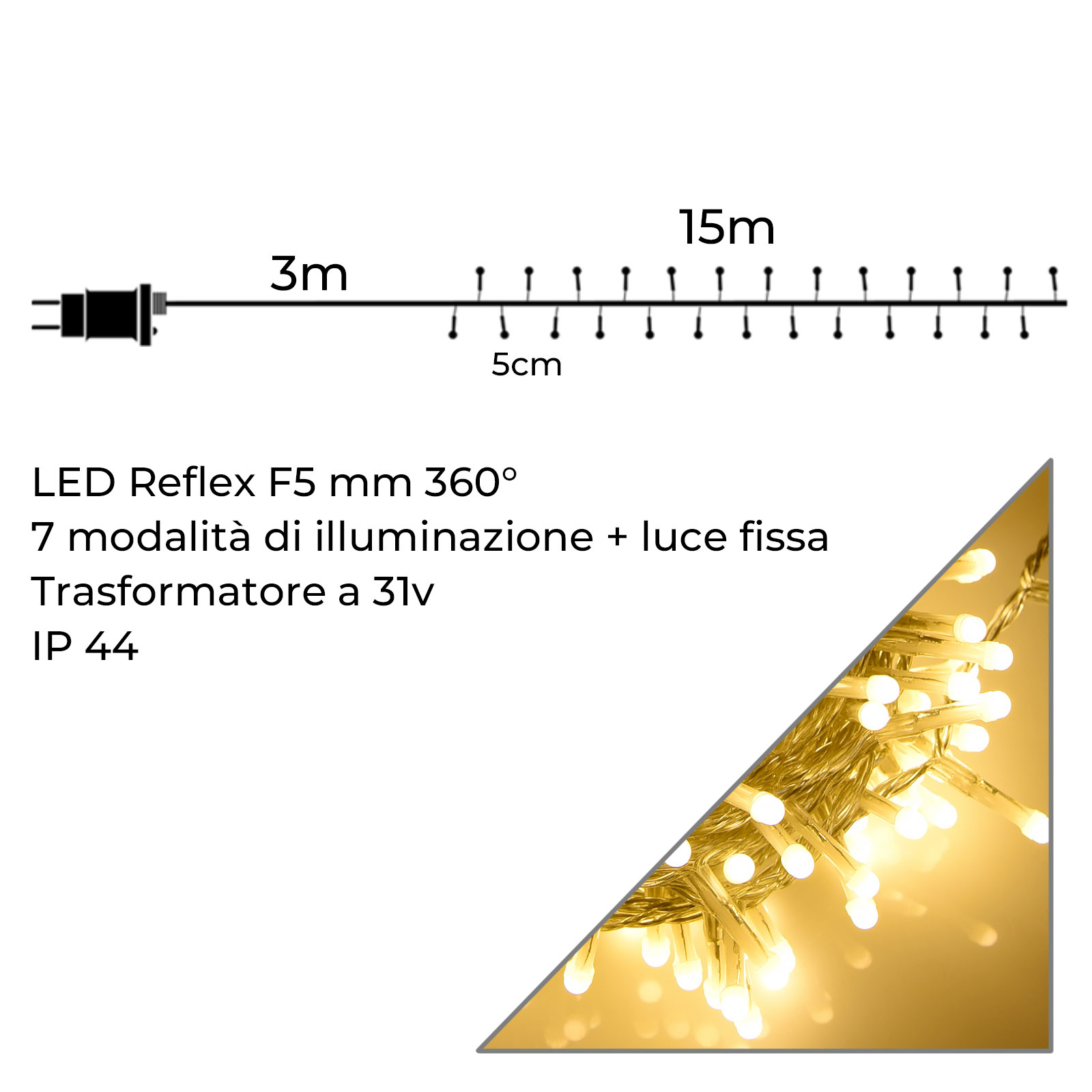 Questa catena luminosa di Natale con 300 LED è perfetta per chi desidera illuminare e decorare ambienti interni ed esterni con un'atmosfera calda e accogliente. Con un cavo trasparente di 15 metri e una luce calda a bassa tensione da 31V, questa catena LED è dotata di protezione IP44, che la rende resistente alle intemperie e ideale per un uso esterno in giardini, balconi, gazebi, e spazi all’aperto. La sua installazione è altrettanto agevole per ambienti interni come salotti, vetrine, e camere, dove crea una luce elegante e piacevole per ogni occasione, dal Natale a eventi speciali. Il design a LED tondo garantisce un'illuminazione a 360°, diffondendo la luce in maniera uniforme e intensa, ideale per ottenere un’illuminazione d’impatto ma soffusa, che arricchisce ogni spazio. Con un totale di 8 modalità di illuminazione, inclusa la luce fissa, è possibile personalizzare l’effetto desiderato: dal gioco di luci scintillanti, al lampeggiante, all’effetto dissolvenza. Questa varietà permette di adattare la catena luminosa al contesto specifico, dall'atmosfera più festosa a quella più rilassante. Il cavo trasparente non solo conferisce un look raffinato e minimalista, ma si integra facilmente con qualsiasi decorazione o arredo, garantendo un aspetto pulito anche quando la luce è spenta. Inoltre, il cavo di alimentazione lungo 3 metri permette una maggiore flessibilità nell'installazione, facilitando il collegamento alla presa più vicina senza ricorrere a prolunghe aggiuntive. I LED sono distribuiti a una distanza di 5 cm l'uno dall'altro, garantendo una distribuzione omogenea della luce su tutta la lunghezza della catena. Grazie al trasformatore a bassa tensione da 31V, la catena LED è sicura e a basso consumo, risultando una scelta ecologica ed economica per l’illuminazione decorativa. Questa caratteristica la rende ideale per un uso prolungato, riducendo il consumo energetico rispetto alle luci tradizionali. Inoltre, la sicurezza è garantita anche in presenza di bambini o animali domestici. Il grado di protezione IP44 è un altro elemento distintivo di questa catena LED, che assicura resistenza a spruzzi d'acqua e polvere. Questa protezione permette di lasciare la catena installata in spazi esterni anche in caso di pioggia, mantenendo un’illuminazione stabile e durevole nel tempo. Questa catena luminosa di Natale da 300 LED è una scelta versatile e di alta qualità per decorare qualsiasi ambiente con stile, comfort e sicurezza. Perfetta per allestimenti natalizi, illuminazione estiva di giardini, oppure come elemento di design per vetrine e locali commerciali, conferisce un tocco di calore e accoglienza che esalta ogni ambiente. Ideale per chi cerca un'illuminazione decorativa efficiente e di grande impatto visivo, con un design elegante che si adatta a ogni contesto