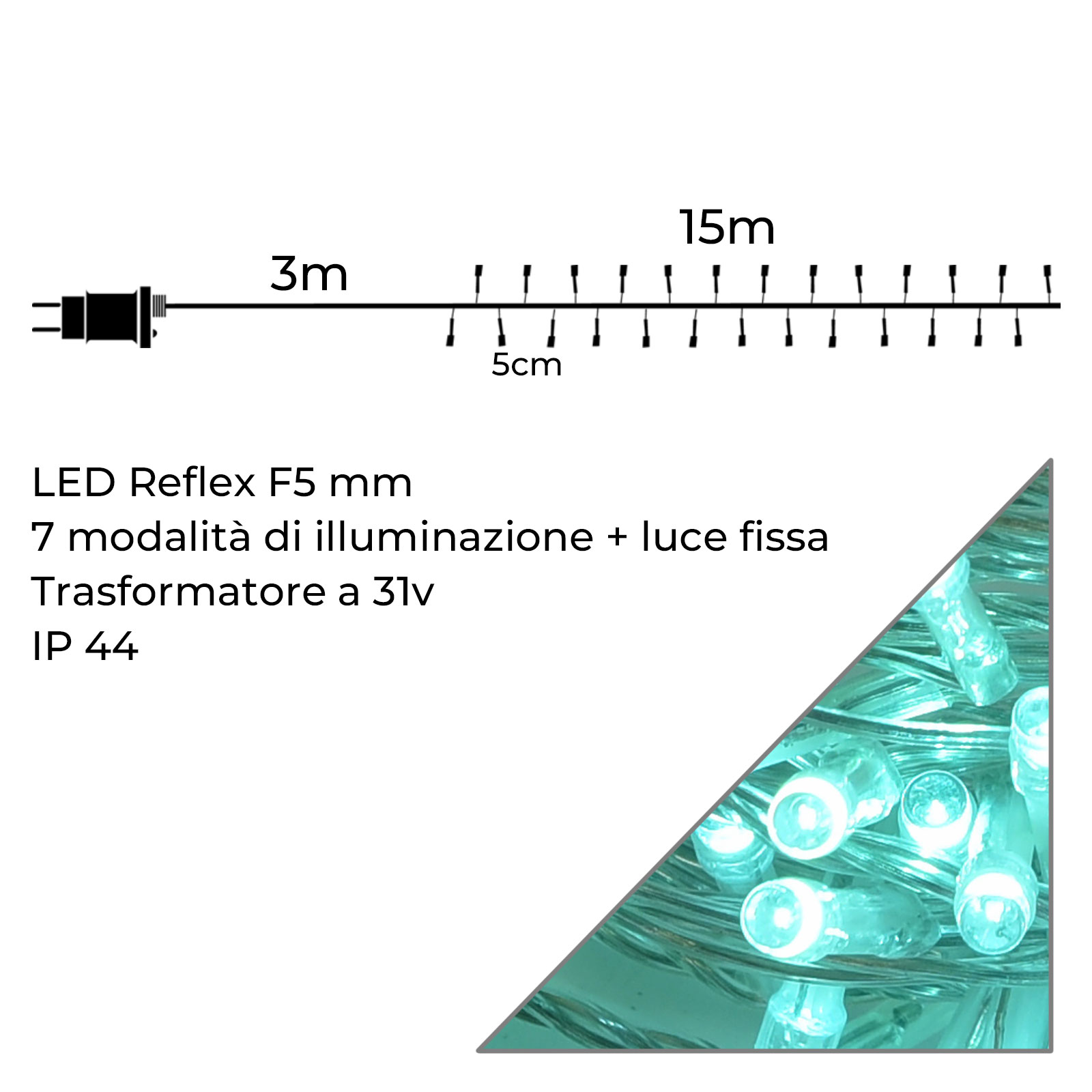 Questa catena LED da 300 luci verde acquamarina con cavo trasparente e alimentazione a bassa tensione di 31V è la scelta perfetta per creare atmosfere suggestive e decorazioni versatili sia all'interno che all'esterno. Con una lunghezza complessiva di 15 metri e un livello di protezione IP44, questa catena luminosa si adatta perfettamente a una vasta gamma di utilizzi. Grazie alla resistenza agli agenti atmosferici, è ideale per addobbare giardini, gazebi, terrazzi, balconi, ma si presta altrettanto bene per decorazioni interne come la valorizzazione di vetrine commerciali, spazi abitativi e allestimenti natalizi o festivi. Il colore verde acquamarina dei LED dona un tocco raffinato e originale, in grado di arricchire ogni ambiente con una luce rilassante e brillante. Questo particolare colore della luce risulta sia elegante che rilassante, ed è perfetto per creare un'atmosfera accogliente e speciale. La distanza tra i LED è di 5 cm, il che garantisce una distribuzione uniforme della luce lungo tutta la lunghezza della catena, consentendo di ottenere un'illuminazione equilibrata e omogenea, ideale per illuminare superfici e oggetti di qualsiasi dimensione. La catena è munita di un controller con 8 giochi di luce, che includono anche la modalità di luce fissa. Le varie modalità di illuminazione permettono di scegliere tra differenti effetti visivi, che spaziano da luci intermittenti a sequenze di lampeggio e dissolvenze, adattandosi a diverse occasioni e preferenze. Questa versatilità la rende una soluzione ideale non solo per le festività ma anche per eventi speciali, cene all’aperto, feste di compleanno, matrimoni, e qualsiasi altra occasione che richieda una decorazione luminosa unica e accattivante. Il cavo trasparente è una scelta intelligente, in quanto si integra in modo discreto con l’ambiente circostante, lasciando protagonisti i LED e creando un effetto di luci sospese, pulito e moderno. La struttura del cavo è flessibile e facile da modellare, così puoi disporre la catena come preferisci, anche intorno a strutture complesse come ringhiere, cespugli, e pergolati. Inoltre, il cavo di alimentazione da 3 metri offre una comoda distanza per raggiungere facilmente prese di corrente, rendendo l’installazione pratica e semplice. Grazie alla tensione di alimentazione a 31V e alla frequenza operativa di 50/60 Hz, la catena LED garantisce un funzionamento sicuro, efficiente e a basso consumo energetico. La bassa tensione riduce infatti il rischio di scosse elettriche e ne consente un uso continuativo e sicuro anche in contesti con bambini o animali domestici. Con 300 LED di tipo F5 mm, questa catena luminosa rappresenta un'ottima combinazione di qualità, funzionalità e stile
