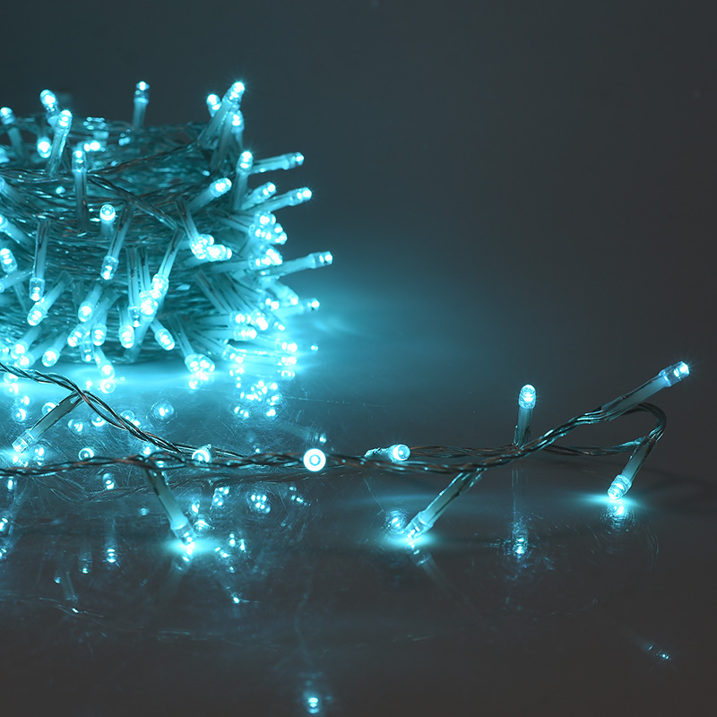 CATENA LED DA 300 LUCI ACQUAMARINA 15 METRI CAVO TRASPARENTE CON TRASFORMATORE 31V - DECORAZIONE VERSATILE PER INTERNI ED ESTERNI