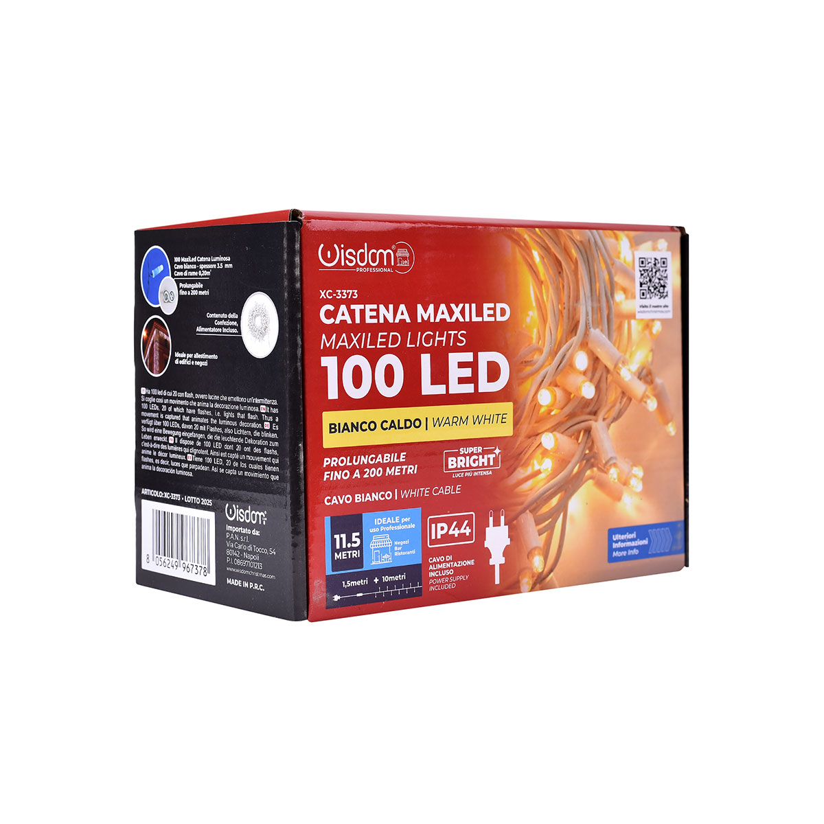 Scopri la qualità e la bellezza della catena luminosa professionale da 100 Maxi LED F8 con cavo bianco e luce calda fissa, lunga 10 metri e prolungabile fino a 20 pezzi (200 metri totali). Questa soluzione di illuminazione decorativa è ideale per creare atmosfere suggestive e accoglienti in ogni occasione, sia all’interno che all’esterno. Grazie al design elegante e alla robustezza dei materiali, si presta perfettamente per decorazioni natalizie, eventi, matrimoni, feste private, allestimenti di vetrine, ristoranti, terrazze, balconi, giardini e spazi pubblici. Il suo aspetto raffinato, unito alla tecnologia Maxiled Reflex F8, offre una resa luminosa potente e uniforme, mantenendo un basso consumo energetico.