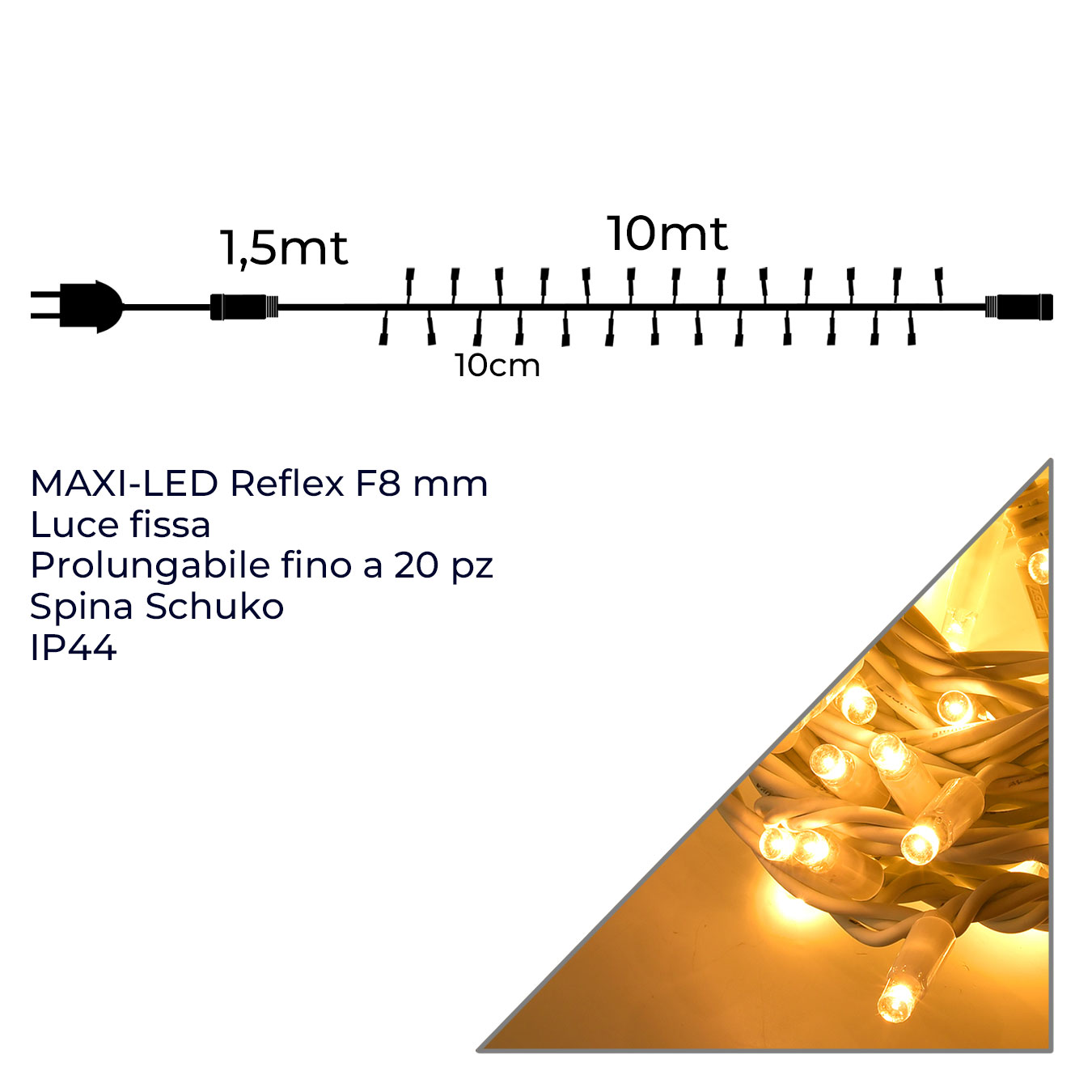 Scopri la qualità e la bellezza della catena luminosa professionale da 100 Maxi LED F8 con cavo bianco e luce calda fissa, lunga 10 metri e prolungabile fino a 20 pezzi (200 metri totali). Questa soluzione di illuminazione decorativa è ideale per creare atmosfere suggestive e accoglienti in ogni occasione, sia all’interno che all’esterno. Grazie al design elegante e alla robustezza dei materiali, si presta perfettamente per decorazioni natalizie, eventi, matrimoni, feste private, allestimenti di vetrine, ristoranti, terrazze, balconi, giardini e spazi pubblici. Il suo aspetto raffinato, unito alla tecnologia Maxiled Reflex F8, offre una resa luminosa potente e uniforme, mantenendo un basso consumo energetico.