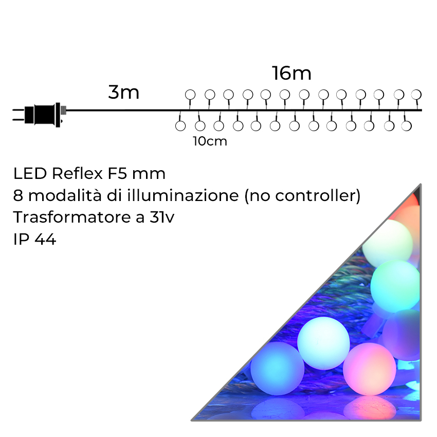 Infografica Catena 160 Luci LED a Forma di Perla Multicolore con Cavo Trasparente IP44