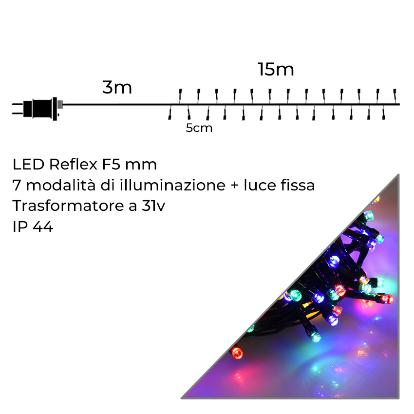 Porta lo splendore delle luci festose nella tua casa o nel tuo spazio esterno con la nostra catena luminosa da 300 LED multicolore. Questo straordinario prodotto, lungo 15 metri con cavo verde, è la soluzione ideale per creare un'atmosfera magica e accogliente in qualsiasi occasione. Dotata di un trasformatore 31V a bassa tensione, la nostra catena è progettata per essere utilizzata sia all'interno che all'esterno, grazie al suo grado di protezione IP44 che la rende resistente a spruzzi d'acqua e agenti atmosferici. Con un totale di 300 LED distribuiti uniformemente lungo il cavo flessibile, questa catena offre una luminosità intensa e vibrante. La distanza di 5 cm tra ogni LED assicura una distribuzione equilibrata della luce, perfetta per illuminare vetrine, corridoi, alberi di Natale, e per decorazioni all'aperto come giardini, balconi e gazebi. Le nostre luci sono munite di un controller facile da usare che permette di scegliere tra 8 diversi giochi di luce, inclusa l'opzione di luce fissa. Questa funzionalità rende la nostra catena adattabile a varie ambientazioni e stili di decorazione, da quelle festose e brillanti a quelle più sobrie e statiche. Il cavo di alimentazione di 3 metri offre una grande flessibilità nell'installazione delle luci, permettendo di posizionarle anche a una certa distanza dalla presa di corrente. Inoltre, il cavo verde si integra perfettamente con l'ambiente, mimetizzandosi tra le foglie e i rami degli alberi, creando un effetto naturale e armonioso. Queste luci non sono solo belle da vedere, ma sono anche progettate per essere sicure. Il trasformatore a bassa tensione garantisce un uso sicuro anche in presenza di bambini e animali domestici, riducendo i rischi associati alle alte tensioni. Ideale per ogni tipo di evento, dalla decorazione natalizia alla festa in giardino, dalla semplice illuminazione serale all'allestimento di grandi eventi, questa catena luminosa offre versatilità e stile. È perfetta non solo per le festività, ma anche per eventi come matrimoni, compleanni, e altre celebrazioni che richiedono un tocco di luce e colore. La nostra catena LED è quindi un investimento perfetto per chi cerca una soluzione di illuminazione duratura, sicura e esteticamente piacevole. Che tu voglia aggiungere un po' di luce a una serata tranquilla in casa o trasformare un giardino in uno spazio festoso e accogliente, le nostre luci sono la scelta giusta per te