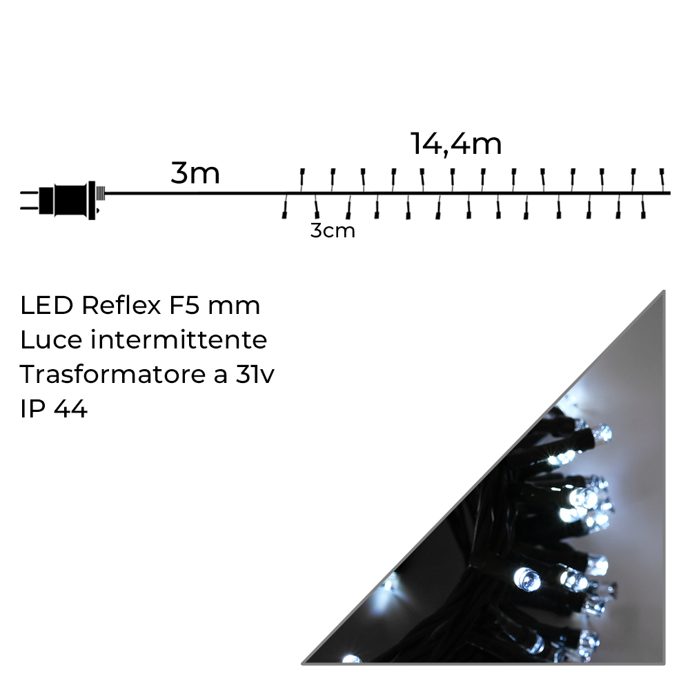 CATENA 480 LED BIANCHI INTERMITTENTI CAVO VERDE DA 14,4MT PER INTERNI/ESTERNI IP44 - ILLUMINAZIONE A BASSA TENSIONE