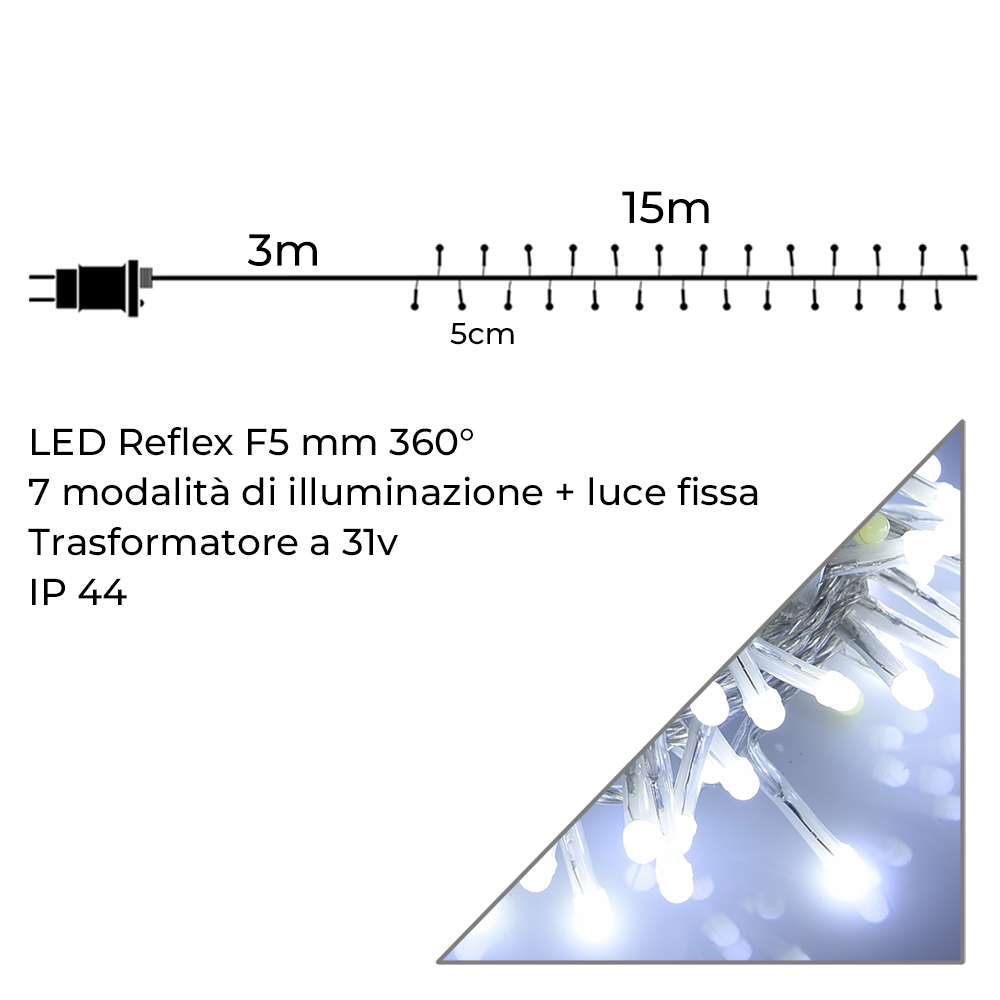 Infografica Catena 300 LED a 360° da 15 Metri Cavo Trasparente Luce Bianca