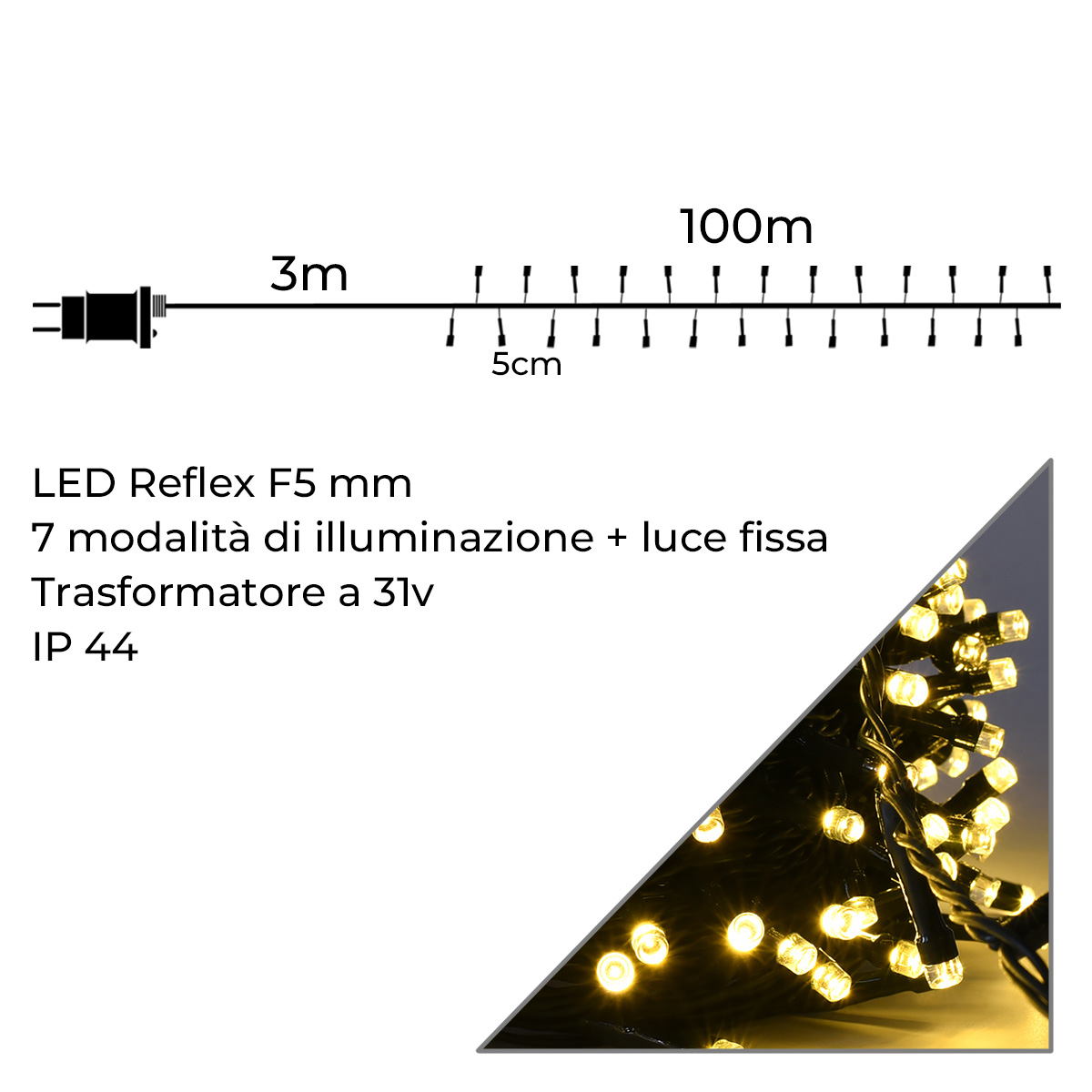 CATENA DI LUCI LED GIALLI LUCE CALDA DA 2000 LED SU 100M DI CAVO VERDE TRASFORMATORE 31V - PER INTERNI ED ESTERNI