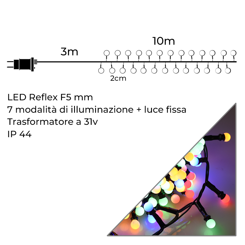 Infografica Catena Luminosa 500 LED a Sfera Luce Multicolore da 10 Metri Cavo Nero