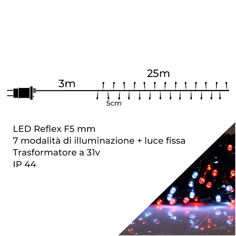 Infografica Catena Luminosa 500 LED Luce Bianca e Rossa da 25m con Cavo di alimentazione da 3m