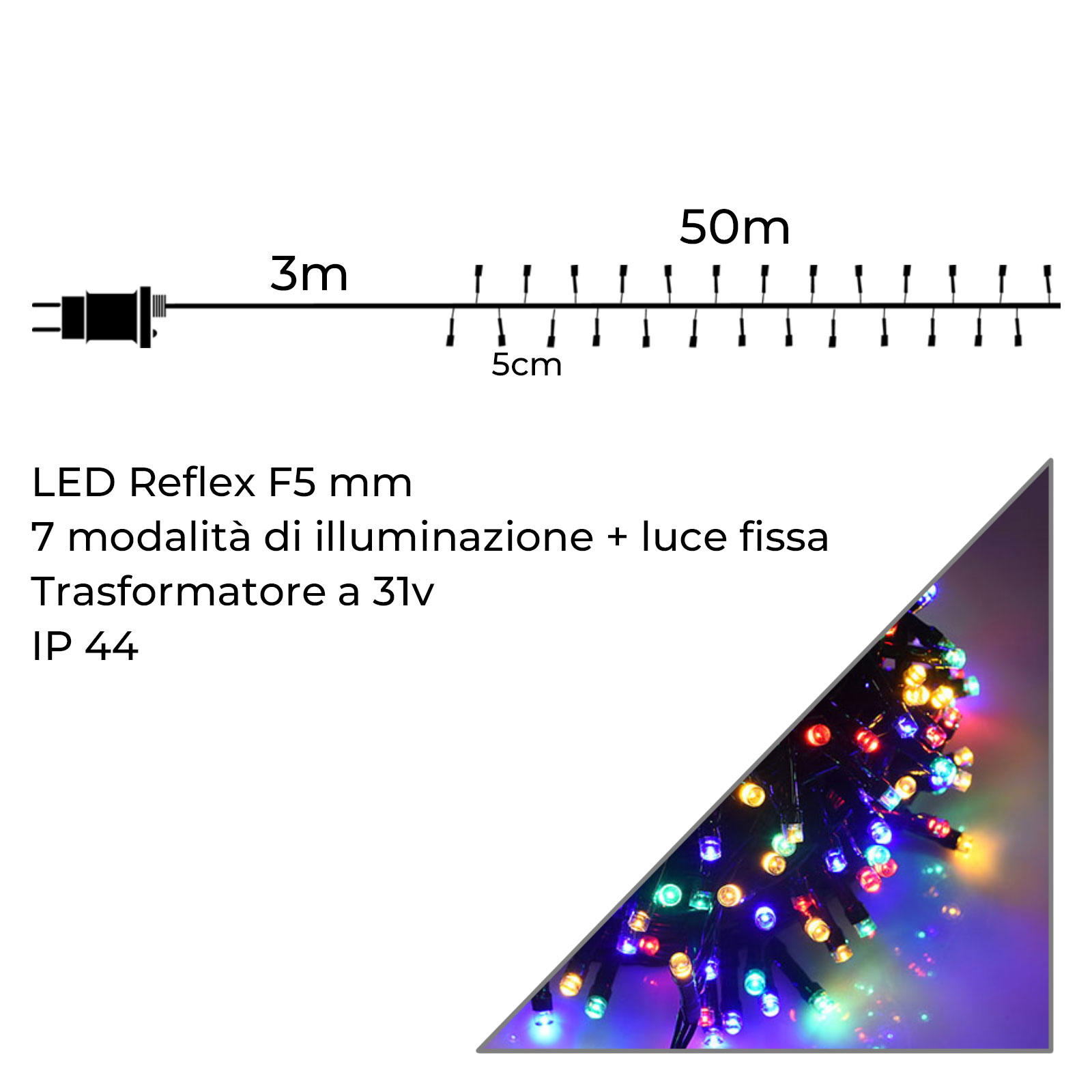 Infografica Catena 1000 LED Multicolore da 50 Metri Filo Verde per Interni ed Esterni