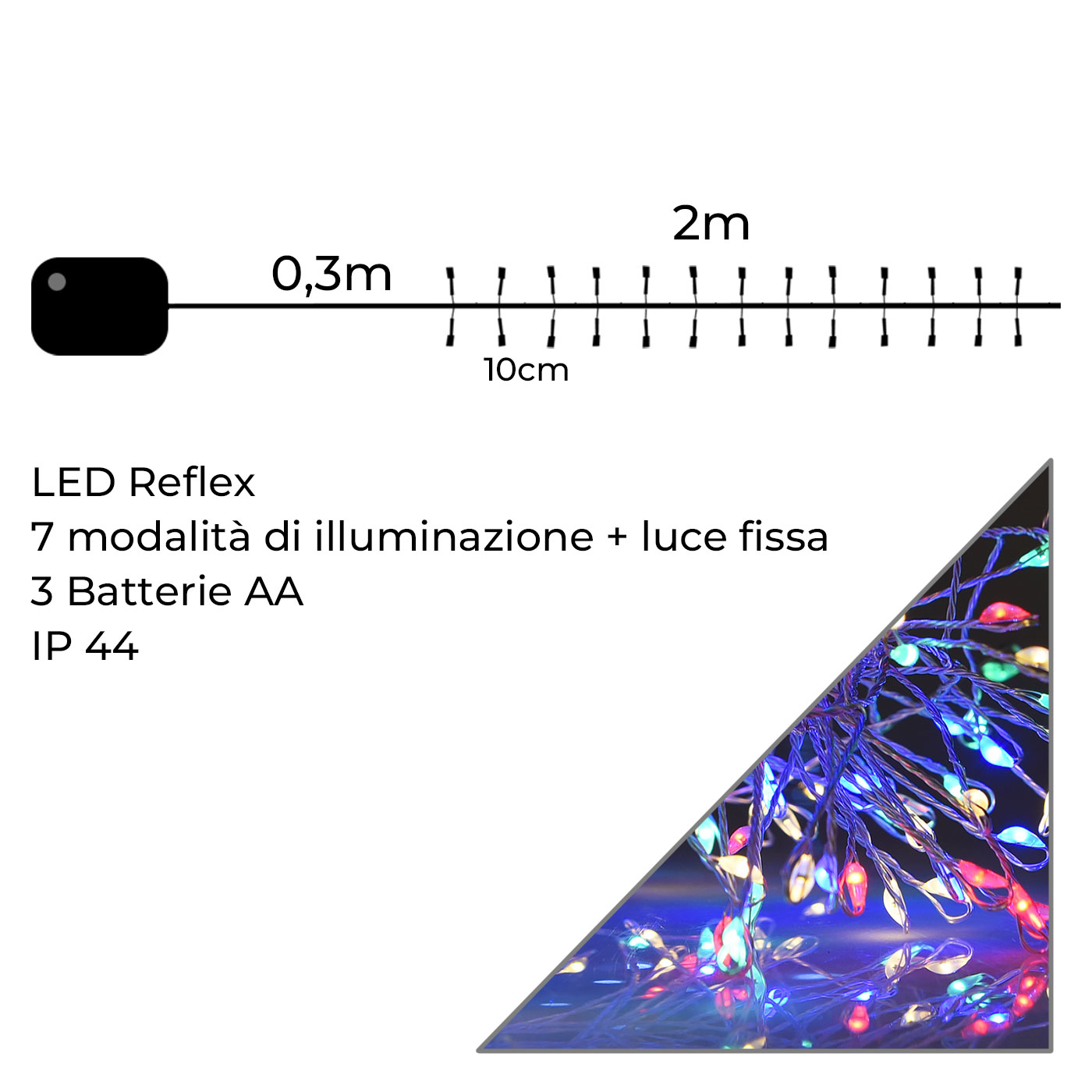 Infografica Catena a Batteria con 200 LED Multicolore su Filo di Rame da 2 Metri