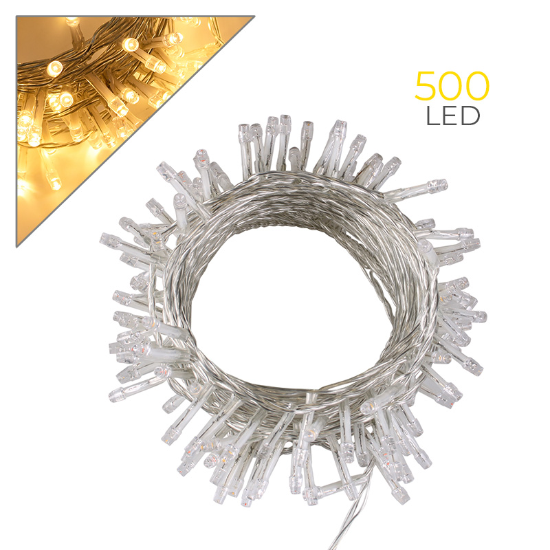 CATENA LUMINOSA NATALIZIA DA 500 LED CAVO TRASPARENTE LUCE GIALLA DA 25 METRI - ILLUMINAZIONE DECORATIVA CON 8 GIOCHI DI LUCE