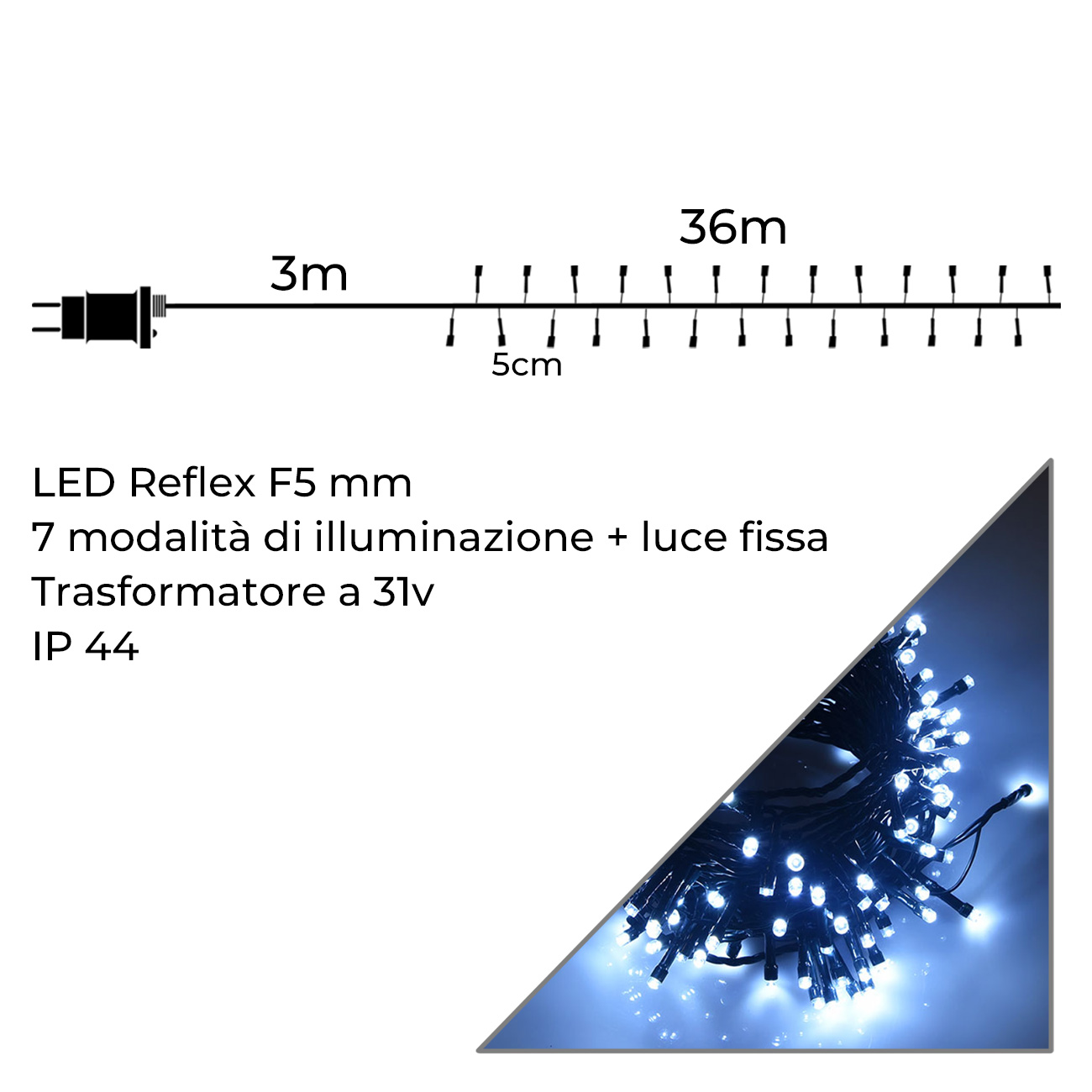 Infografica Catena 720 Luci LED Bianchi su 36 Metri di Cavo Verde Flessibile per Interni ed Esterni