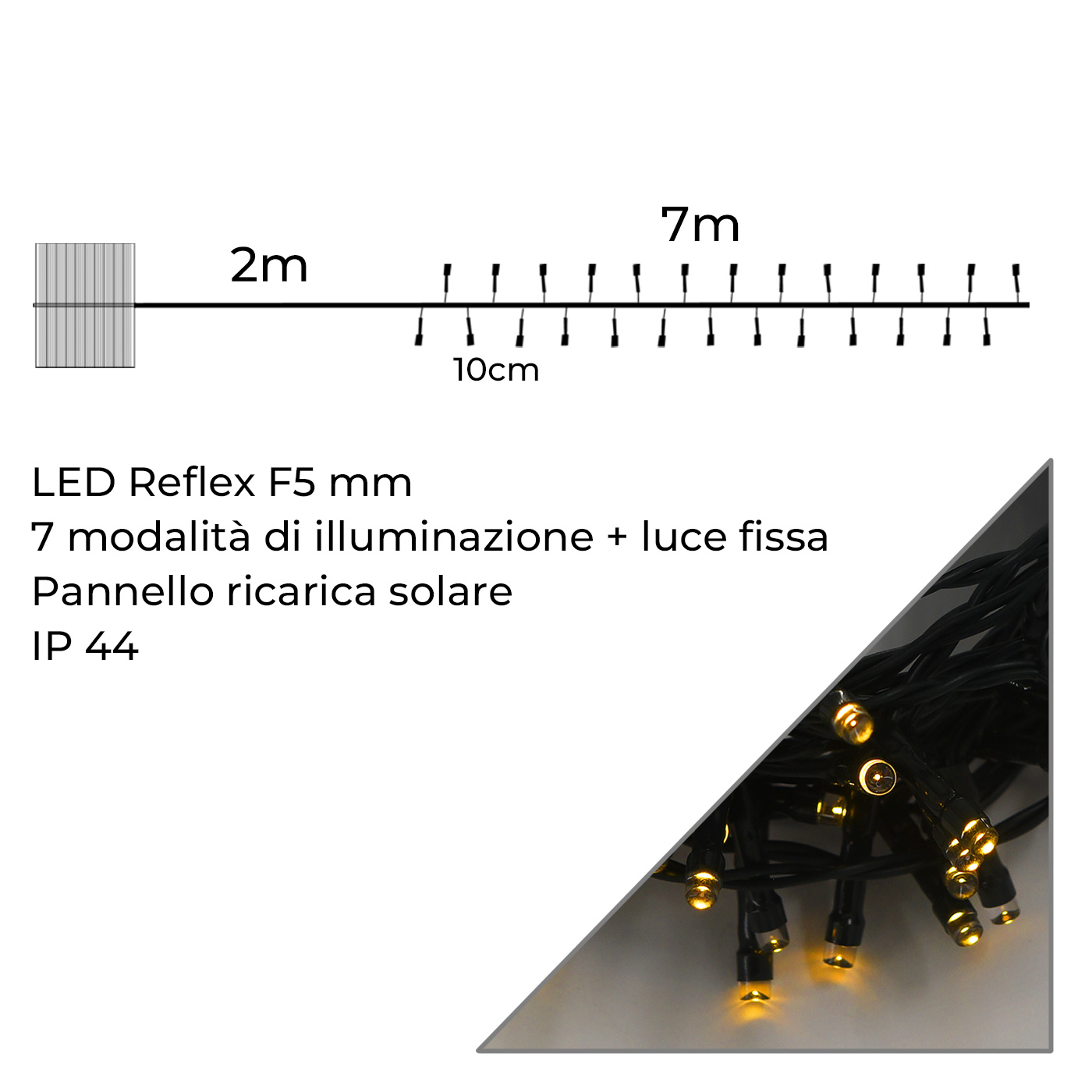 Infografica Catena Energia Solare con 100 LED a Luce Calda Cavo Verde da 7 Metri