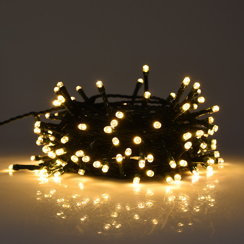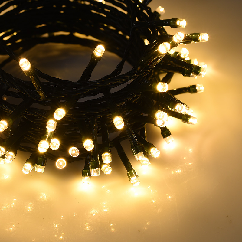 La magia del Natale si accende con la nostra esclusiva catena di luci da 300 LED a luce gialla, estendendosi per 15 metri di pura brillantezza. Progettata con un elegante cavo verde, questa catena LED non è solo un accessorio luminoso, ma un vero e proprio elemento d'arredo che trasforma qualunque ambiente in un luogo incantato. La lunghezza di 15 metri consente di avvolgere spazi grandi e piccoli, sia interni che esterni, creando un'atmosfera calda e accogliente ovunque si desideri. Grazie alla tensione di alimentazione di 31V e al trasformatore a bassa tensione incluso, queste luci sono sicure al tocco e riducono il rischio di surriscaldamento, garantendo un uso sicuro anche per lunghe sessioni di illuminazione. Ogni LED, del tipo F5 mm, è posizionato a una distanza di 5 cm lungo il cavo, creando un effetto luminoso uniforme e continuo che non stanca la vista. Il grado di protezione IP44 assicura che la catena luminosa sia resistente agli spruzzi d'acqua e agli agenti atmosferici, rendendola perfetta per decorazioni all'aperto come giardini, terrazzi, gazebi, oltre che per interni come vetrine, sale da pranzo o corridoi. L'innovativo controller incluso offre 8 giochi di luce diversi, dalla luce fissa alle modalità scintillanti, permettendo di personalizzare l'illuminazione a seconda delle occasioni e delle preferenze personali. Questa catena LED non solo è esteticamente gradevole ma anche ecologica ed efficiente dal punto di vista energetico. Il consumo ridotto di energia elettrica assicura che il tuo spettacolo di luci non sarà un peso sulla bolletta elettrica, promuovendo un Natale più verde. La facilità di installazione è garantita dal cavo di alimentazione di 3 metri che offre flessibilità nel posizionamento, mentre la forma flessibile del cavo permette di adattarsi a qualsiasi angolo, bordo o superficie. Che tu desideri creare un accogliente angolo di lettura o illuminare un grande salone per una festa, questa catena LED è la scelta perfetta che combina sicurezza, bellezza e praticità. Perfetta per chi cerca un'illuminazione di qualità, sicura e versatile, questa catena di luci LED è l'ideale per esaltare la bellezza dei tuoi spazi durante il periodo natalizio e non solo. Regala a te stesso e ai tuoi cari un Natale luminoso e memorabile con la nostra catena di 300 LED