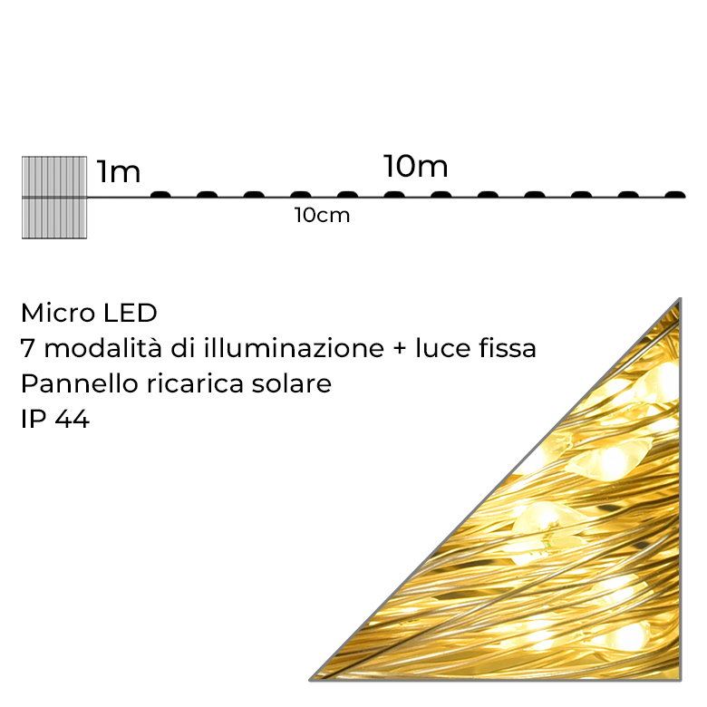 Infografica Catena 100 Micro LED ad Energia Solare da 10m Luce Gialla