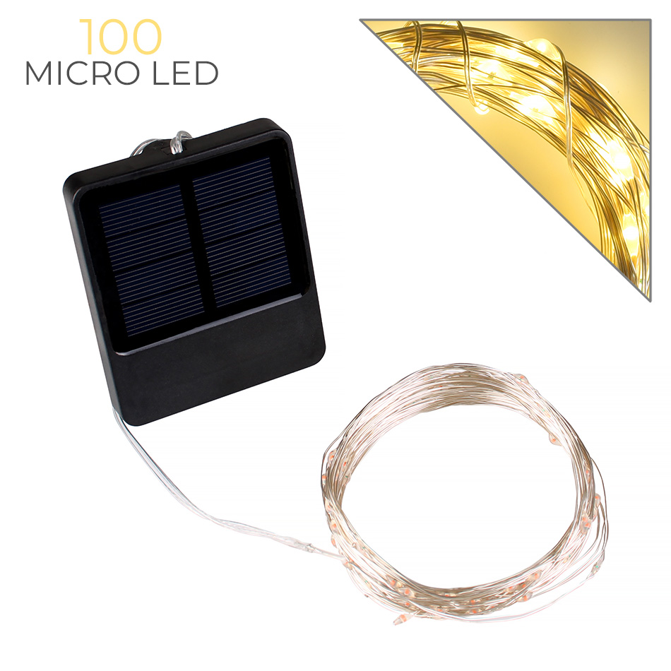 La catena luminosa solare da 10 metri con 100 micro LED gialli è l'accessorio perfetto per creare atmosfere magiche durante le festività natalizie e illuminare con stile giardini e interni. Questo prodotto è dotato di un cavo flessibile di rame, che gli conferisce un design elegante e una grande versatilità di utilizzo