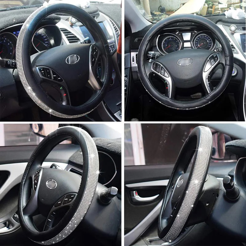Coprivolante per Auto Nero Diamond Strass Bling 38cm Pelle PU Antiscivolo Stile Glitter per Donna Ragazza